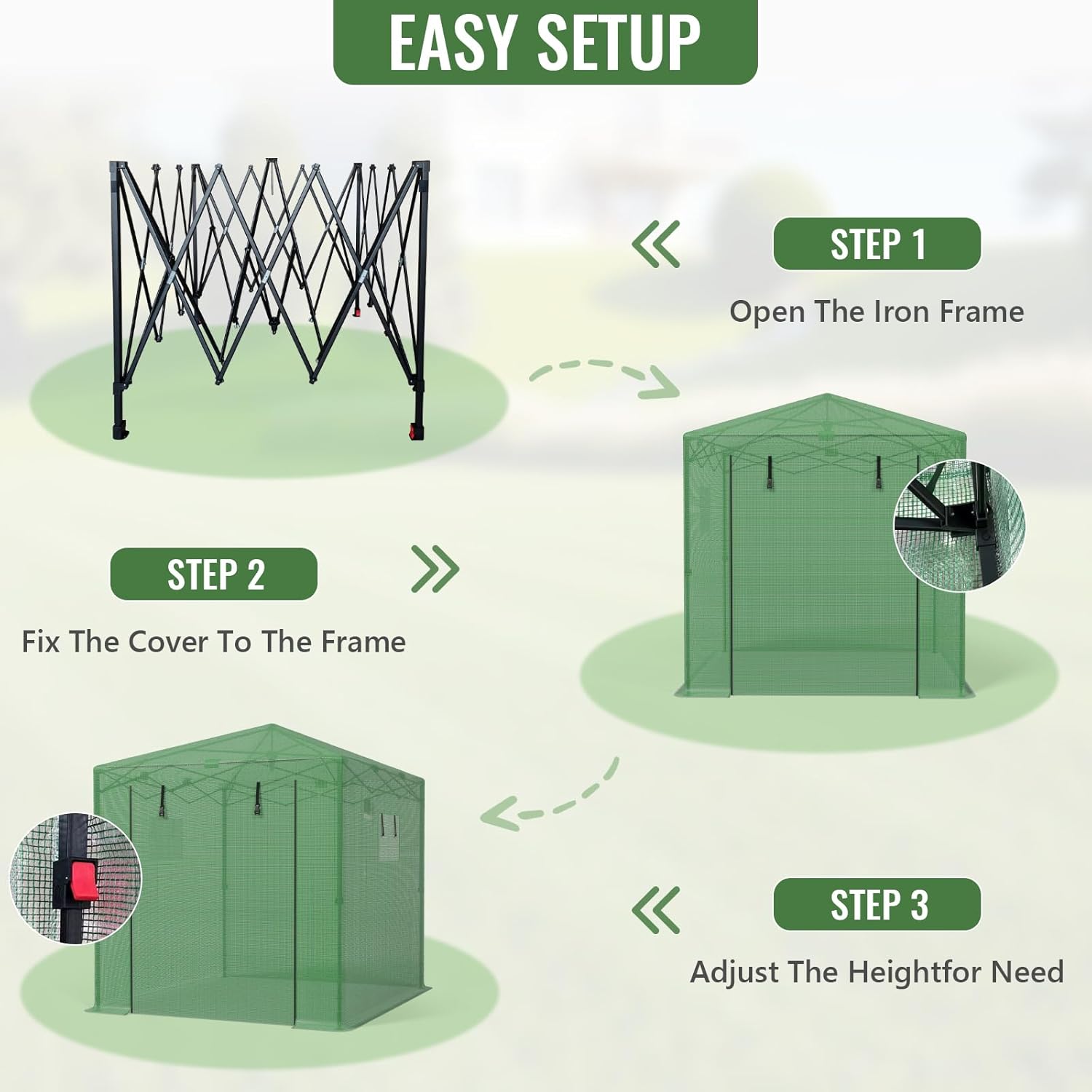 - 【Two-Person Setup for Easy Installation】: Our pop-up greenhouse features a pre-assembled frame that requires two people for easy setup. No tools are needed, and the simple design allows for quick opening and folding, making it ideal for fast installation, transportation, and storage.