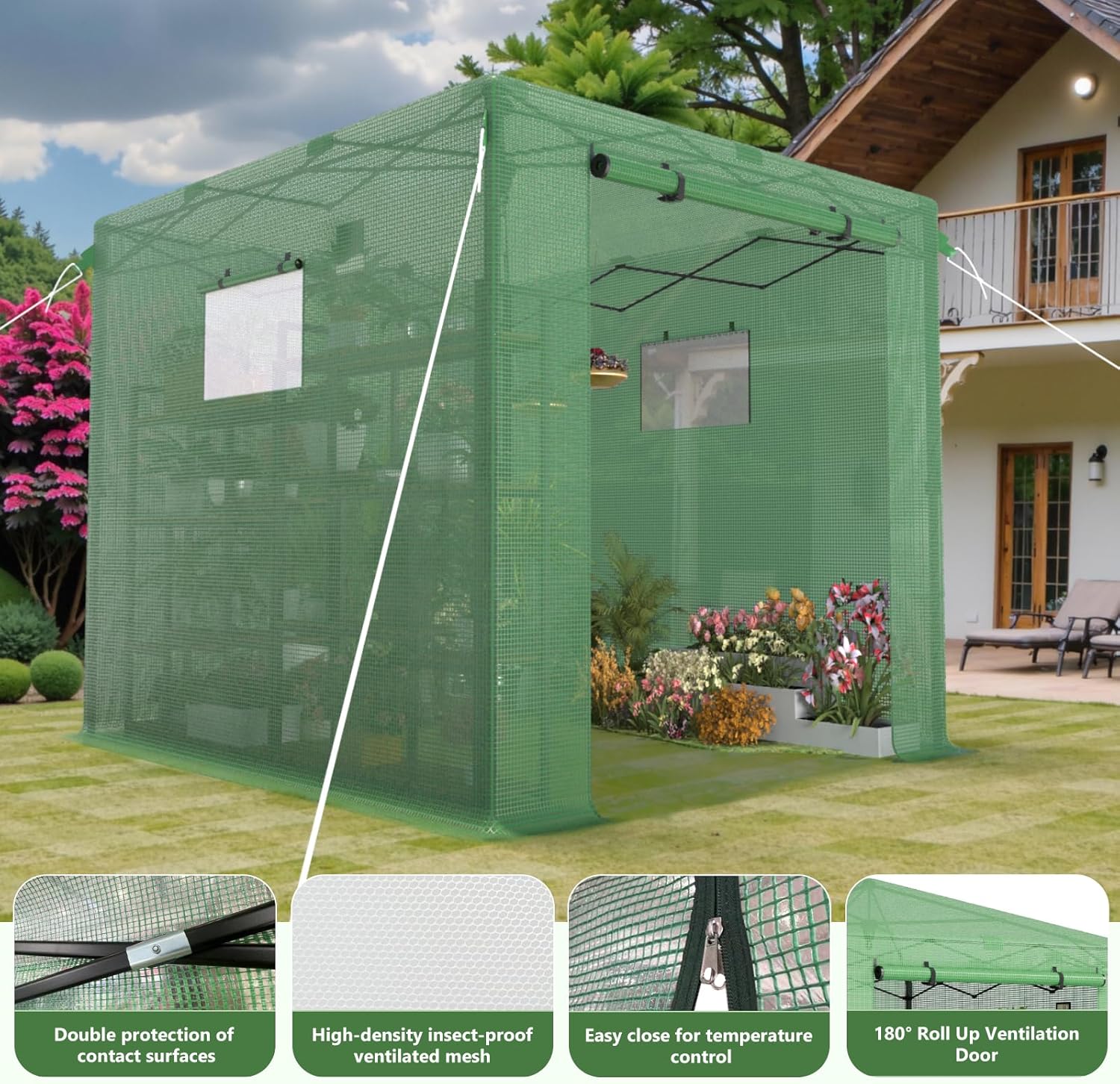 - 【Spacious Walk-In Design with Zipper Door】 This portable greenhouse boasts a spacious walk-in design, allowing easy access and freedom of movement for all your gardening tasks. The roll-up zipper door provides a wide entry point, while the side mesh windows allow for optimal ventilation, keeping the temperature inside regulated and the air fresh.