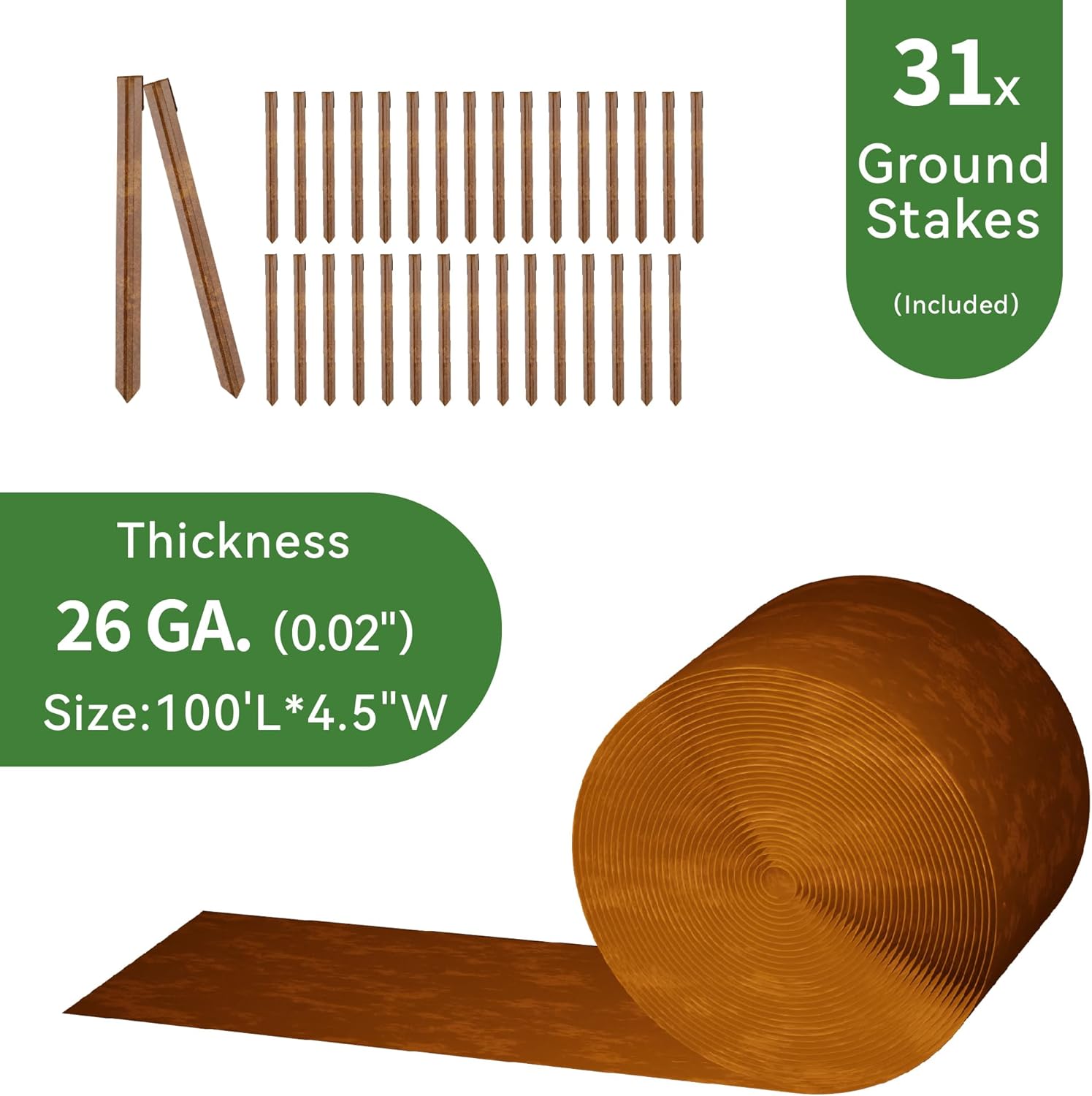 Worth Galvanized Steel Landscape Edging 4.5" x100' Metal Garden Edging Roll Flexible Bender Border with 31Pcs Stakes for Lawn, Flower Bed Edges, Rust-Like Color