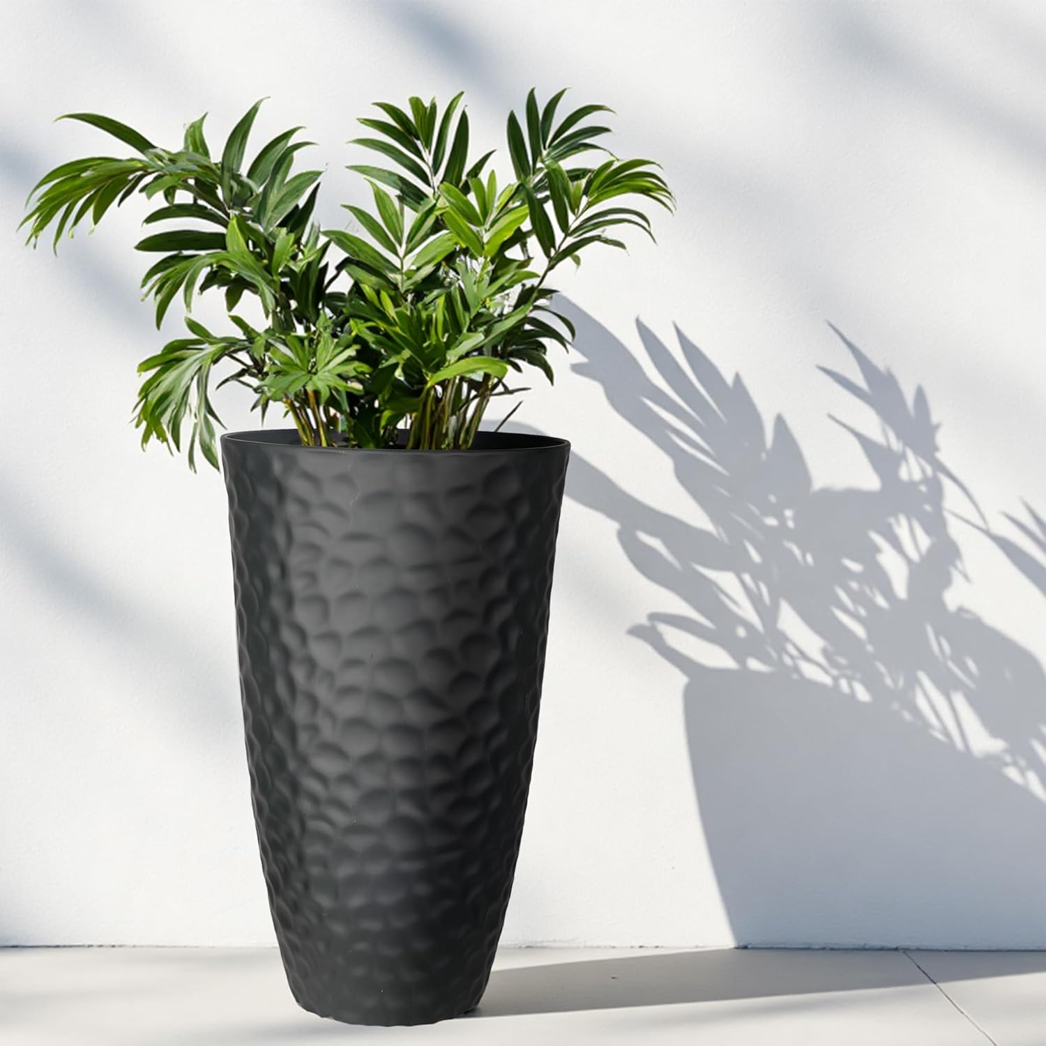 Worth Garden 24" H Tall Hammered Texture Planters Set of 2 - Matte Black Plastic Flower Pot with Drainage Holes, Modern Outdoor Indoor Lightweight Pots for Large Plants, Durable Decor Containers