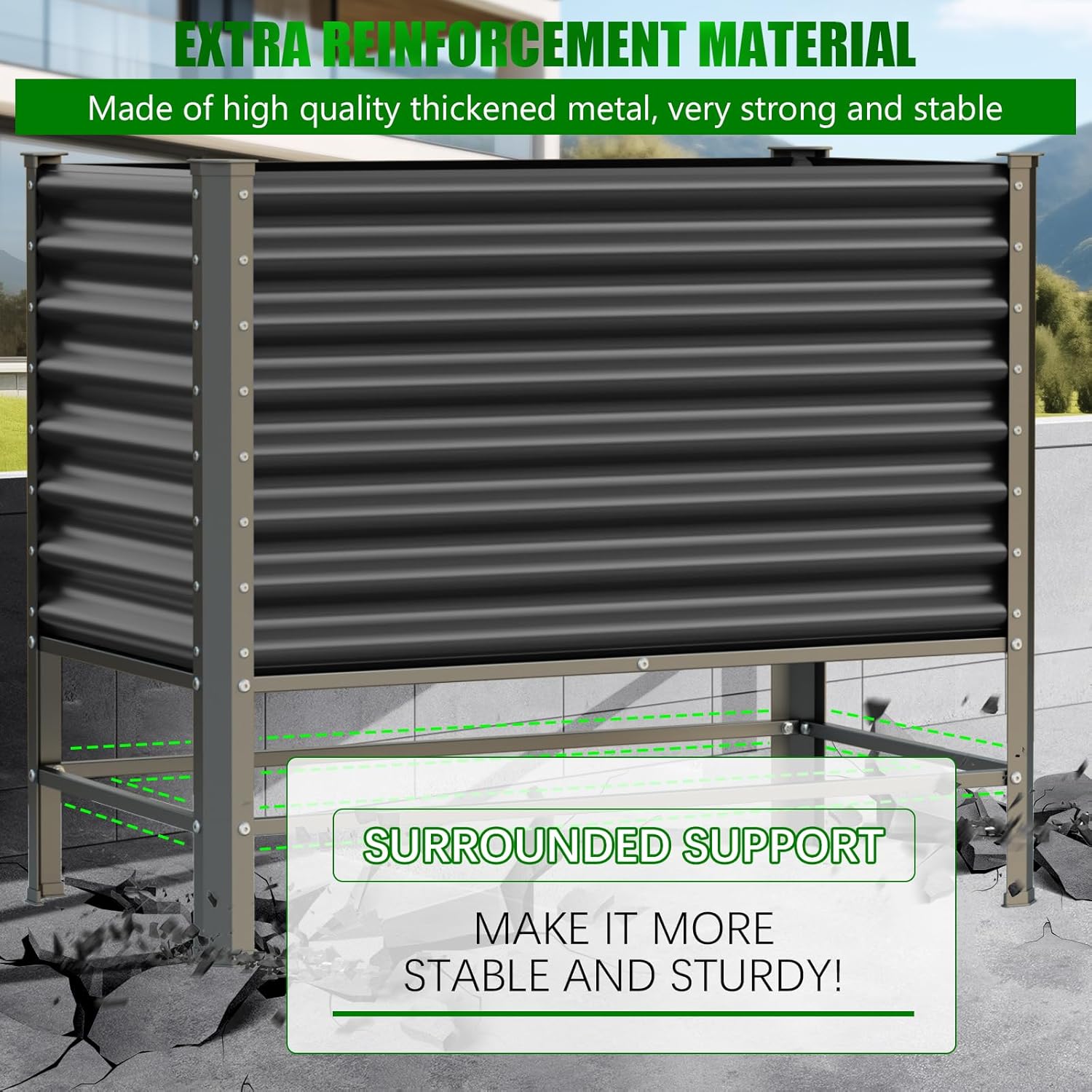 - 【Distinctive Design】-Outdoor elevated garden beds, our custom design style features galvanized sheet metal on the top, a stainless steel frame on the middle base, and the lower four corners are made of heavy-duty steel with a black powder-coated finish,This combination exceeds the lifespan of wooden products and ensures excellent rust resistance to keep the garden bed in the best condition for a long time.