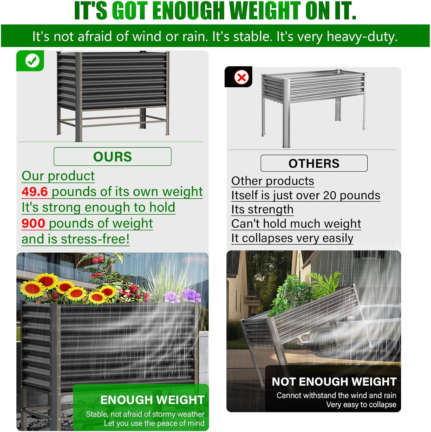 - 【Spacious Planting Space】-Our raised garden bed with legs measures 48x24x37 inches, 120 gallons, 900LB capacity.To enhance safety and prevent any potential discomfort, we've added protective pads to the four corners both above and below the raised garden bed. These pads not only effectively safeguard against sharp corners that may poke individuals but also provide protection for your floors by preventing scratches.