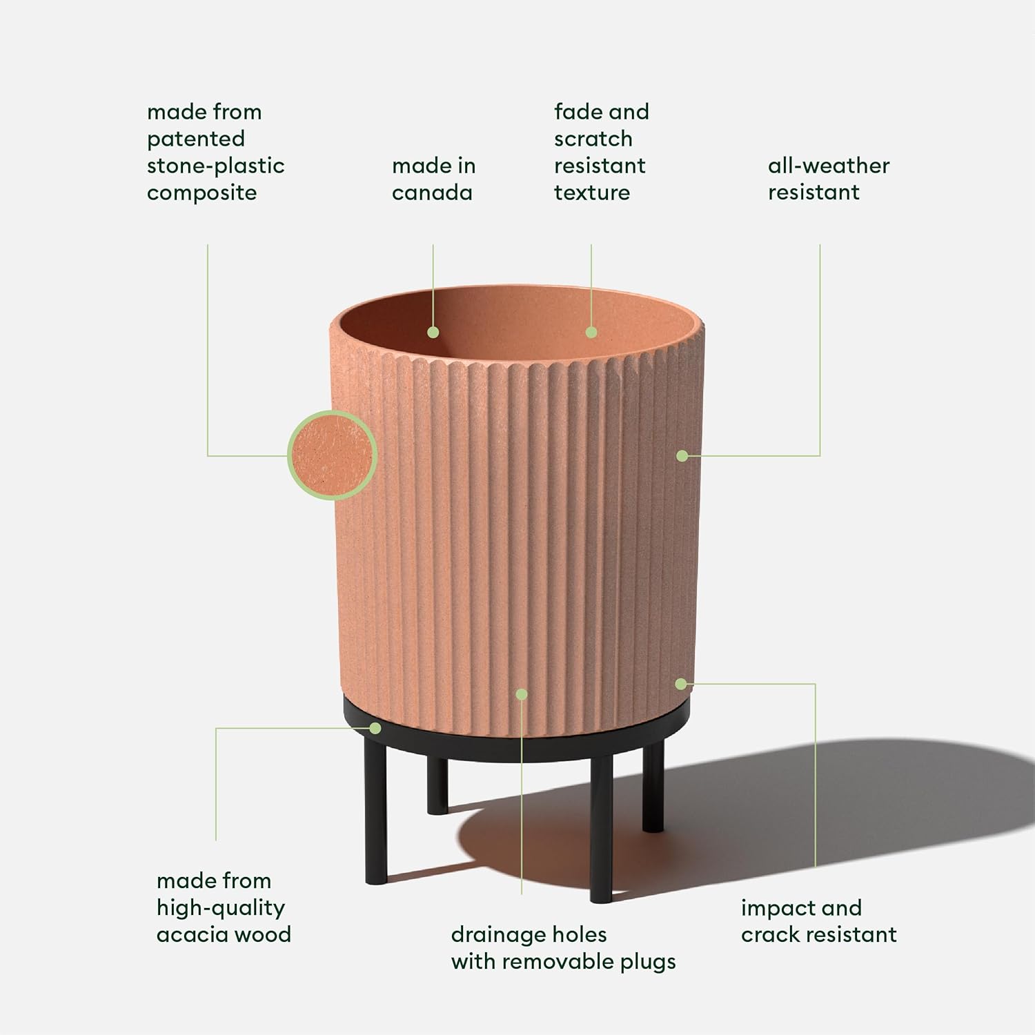Veradek Demi Series Round Planter w/Stand for Porch/Patio | Durable Plastic-Stone Composite & Wooden Stand | Modern Décor for Tall Plants, Flowers