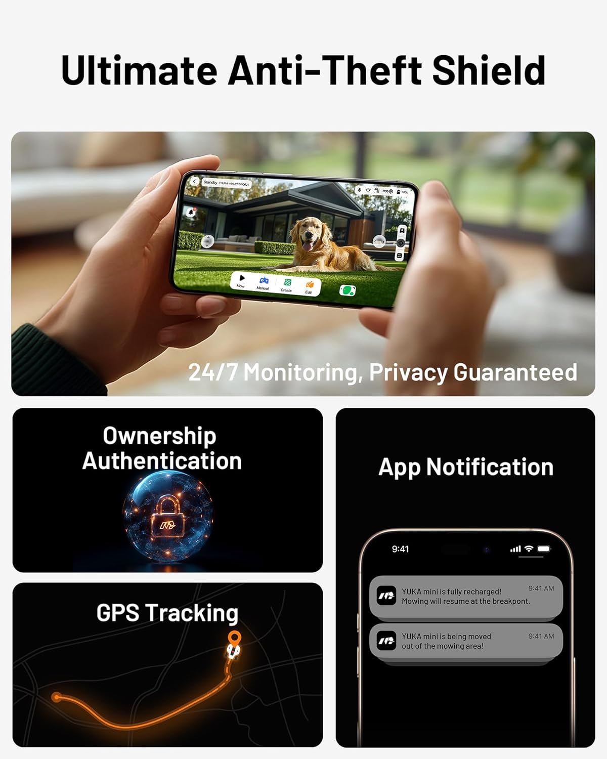 - Ultimate Anti-Theft & Easy Maintenance: Enjoy 24/7 monitoring with GPS tracking, app notifications, ownership authentication for maximum security. Weighing just 23 pounds, this lawn mower is easy to maintain and features an IPX6 waterproof rating.