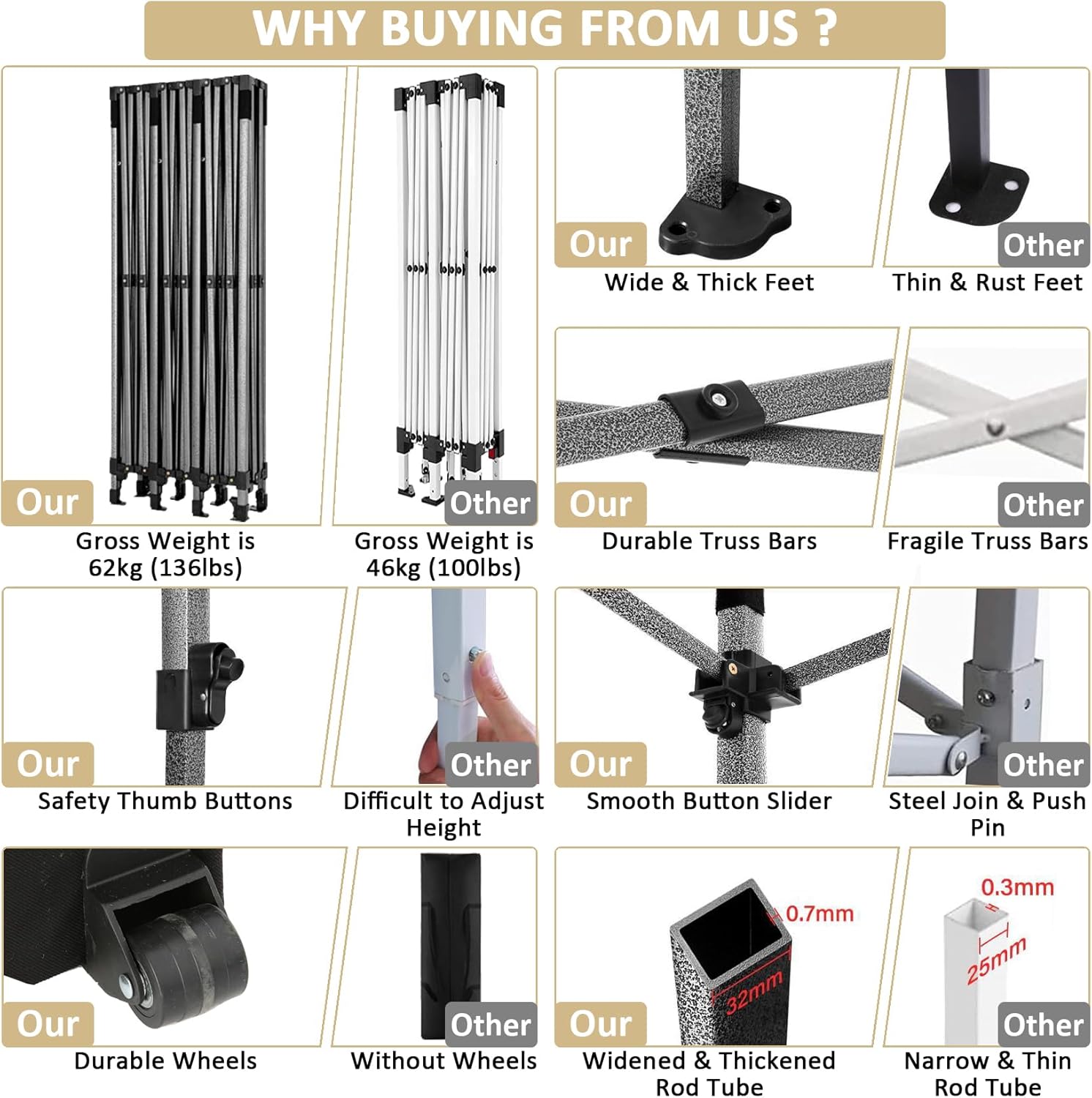 - 【3 Height Settings】10x30 pop up party tent straight leg has 3 height settings. Thumb latch lock system easy to lock and release, raise the pop up tent to a desired height. Canopy tent 10x30 straight leg height options: 220cm/86.6inch, 230cm/90.5inch, 240cm/94.5inch. Corresponding party tent center height options: 305cm/120inch, 315cm/124inch, 325cm/128inch. 10x30 canopy perfect for commercial activities, camping, festivals, tailgating, backyard events and etc..