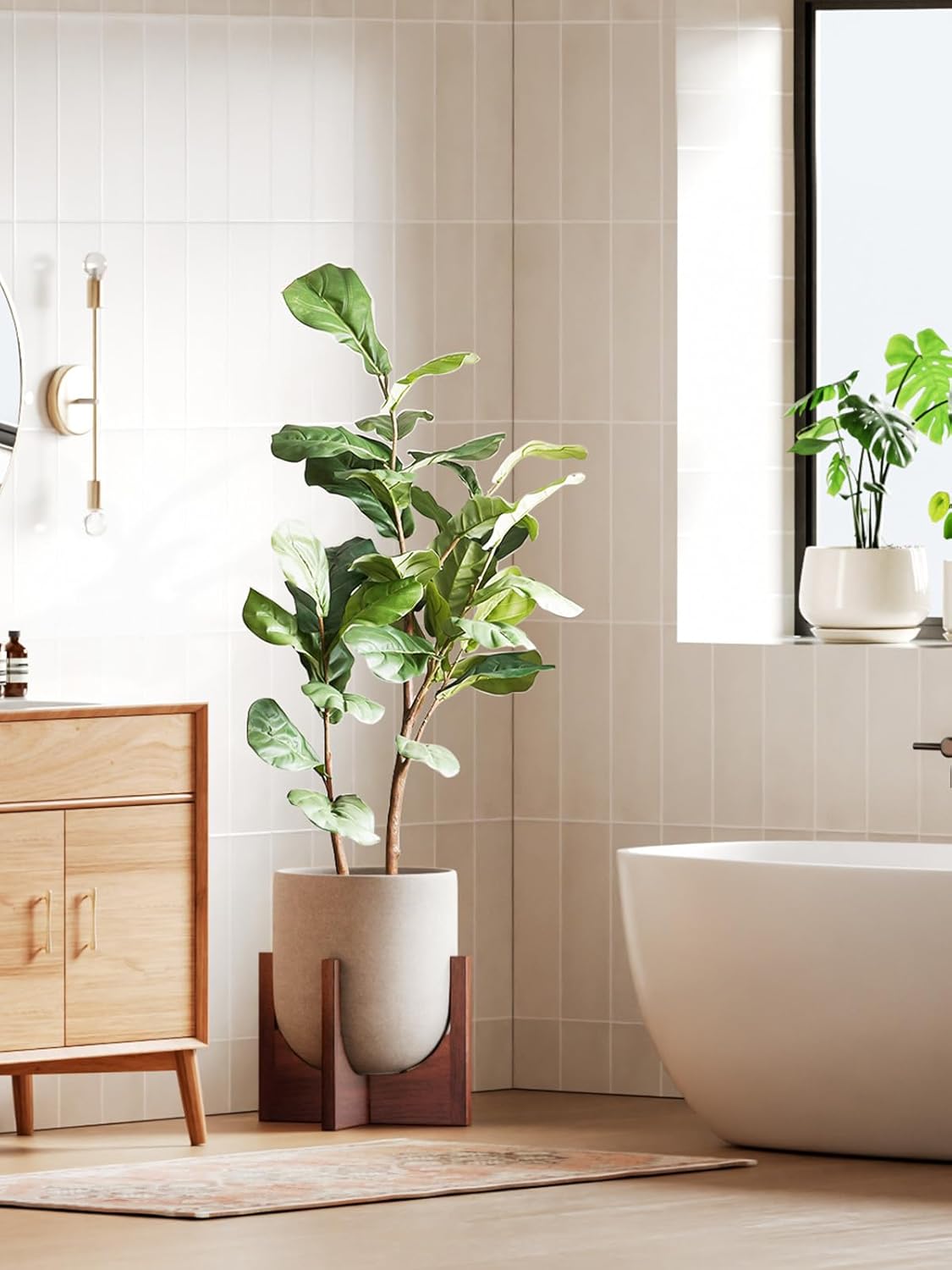 - Premium Ceramic and Wood: Our 12 inch pot for plants is crafted from durable ceramic and paired with a sturdy acacia wood stand; The white exterior features a satin finish that complements the wood grain, creating a minimalist and elegant aesthetic; And the unglazed interior provides a suitable environment for optimal growth