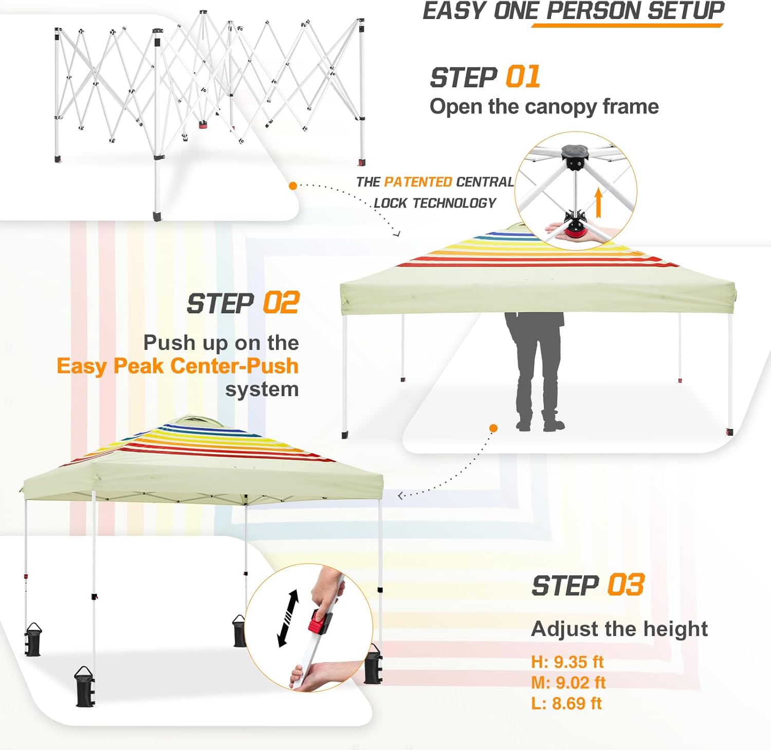 - EASY SETUP: This easy setup pop up canopy tent features the Peak Push system, a patented canopy center lock. The portable canopy requires no tools and easily opens and closes from the center in seconds. Its unique canopy tent center lock enables a quick, one person setup, letting you maximize outdoor time with minimal effort