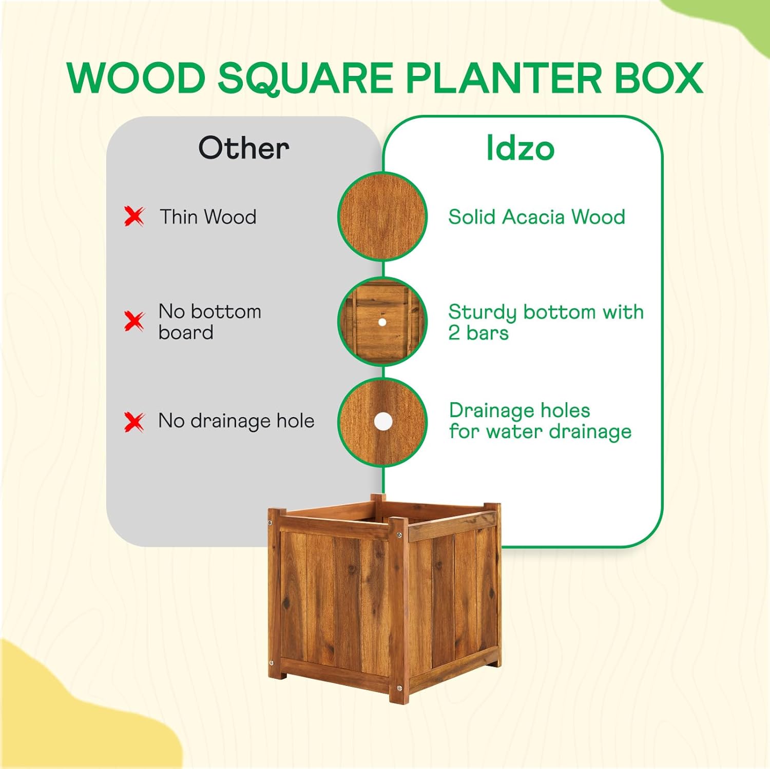 - EFFECTIVE DRAINAGE HOLES: Our garden boxes outdoor raised have drainage holes at the bottom to let excess water escape, encouraging strong root development for thriving plants without overwatering concerns