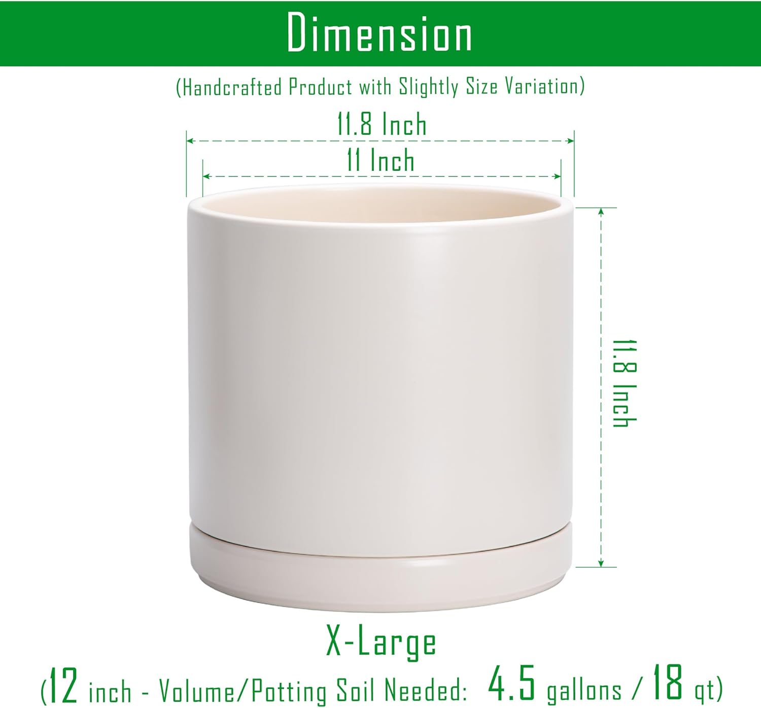 - X-Large 12 Inch Planter Pot: 11.8" Diameter x 11.8" H, oatmeal color. Potting Soil Needed: 4.5 gallons / 17 qt.