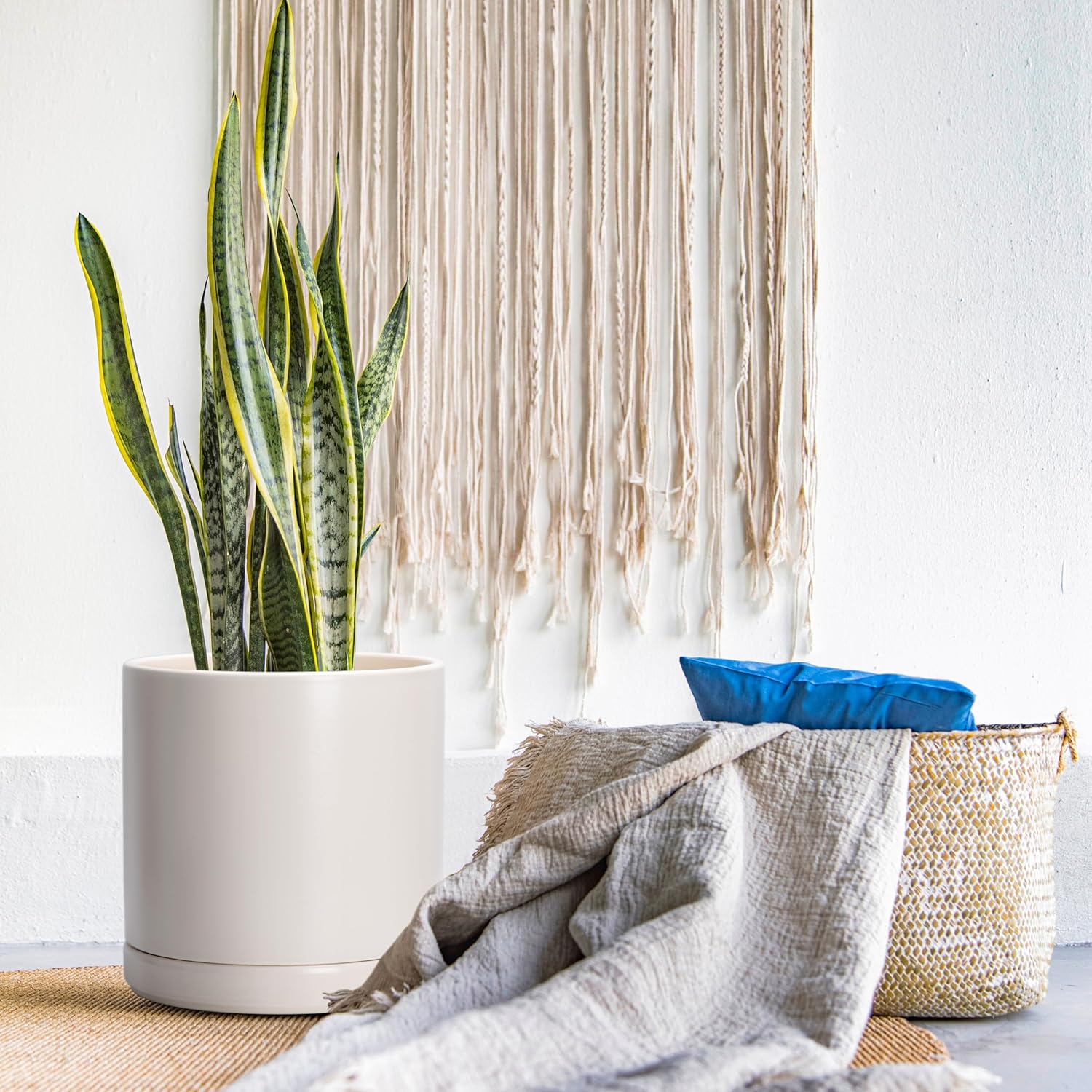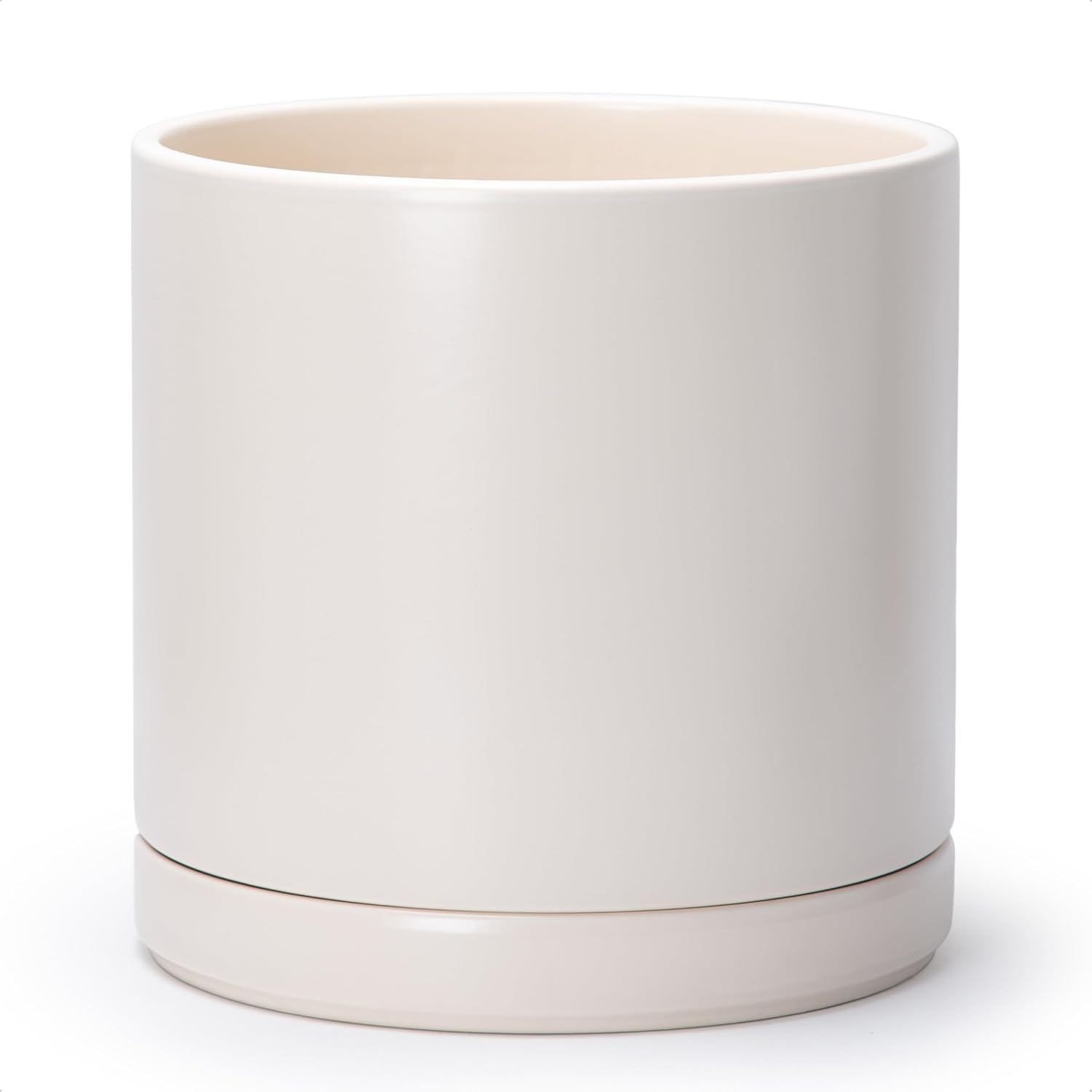 - Simple, elegant, and modern cylindrical straight round planter pot with saucer and drainage hole.
