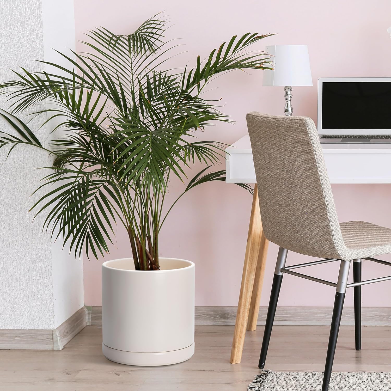 D'vine Dev 12 Inch Ceramic Planter Pot with Drainage Hole and Saucer, Indoor Cylinder Round Planter Pot, Oatmeal, 94-O-F-8