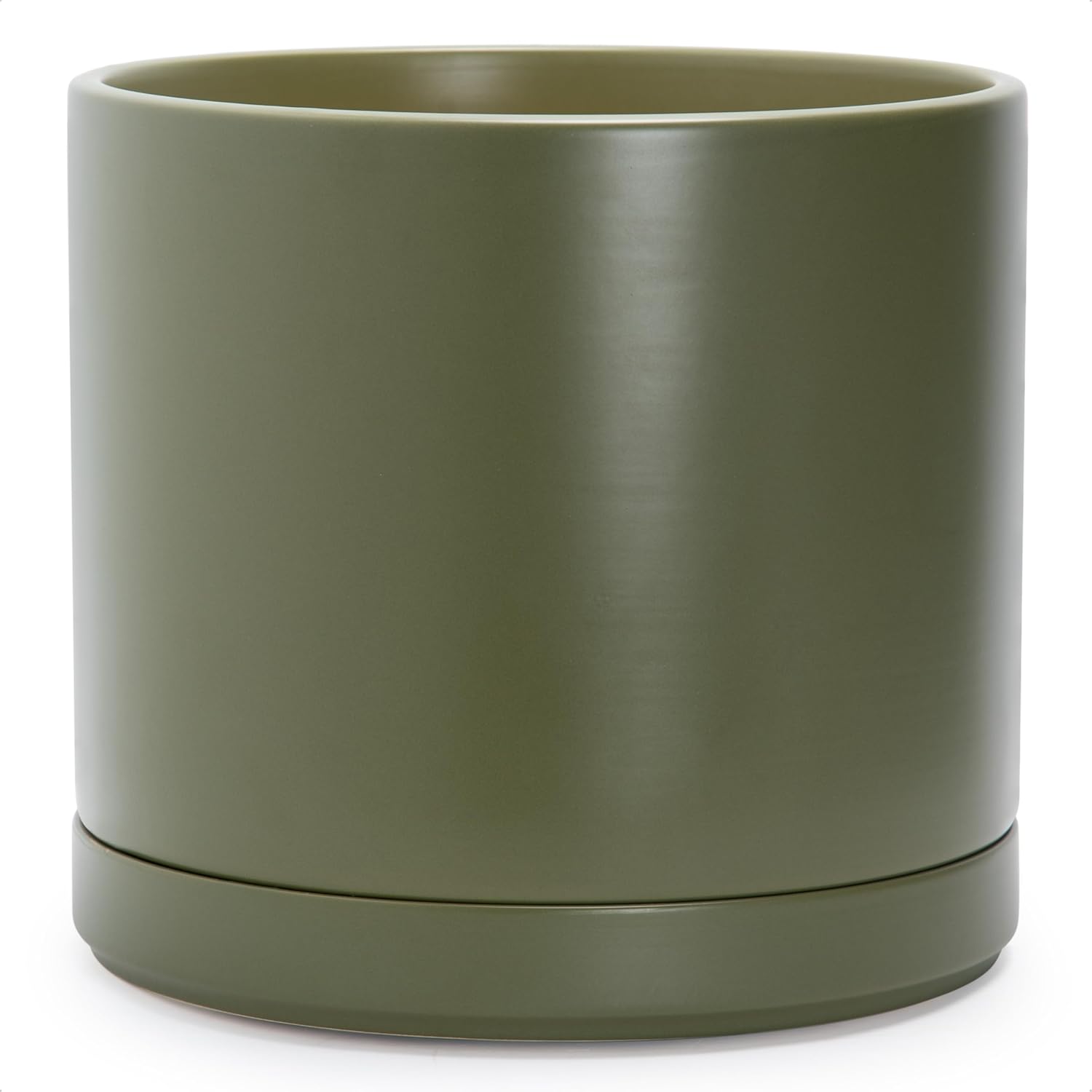 D'vine Dev 14 Inch Ceramic Planter Pot with Drainage Hole and Saucer, Indoor Cylinder Round Planter Pot, Olive, 94-O-G-J