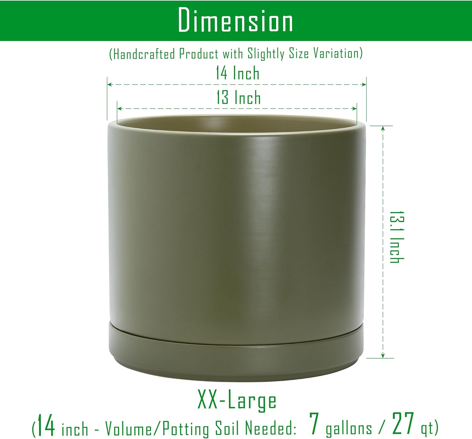 - XXLarge 14 Inch Planter Pot: 14" Diameter x 13.1" H, olive color. Potting Soil Needed: 6 gallons / 24 qt.
