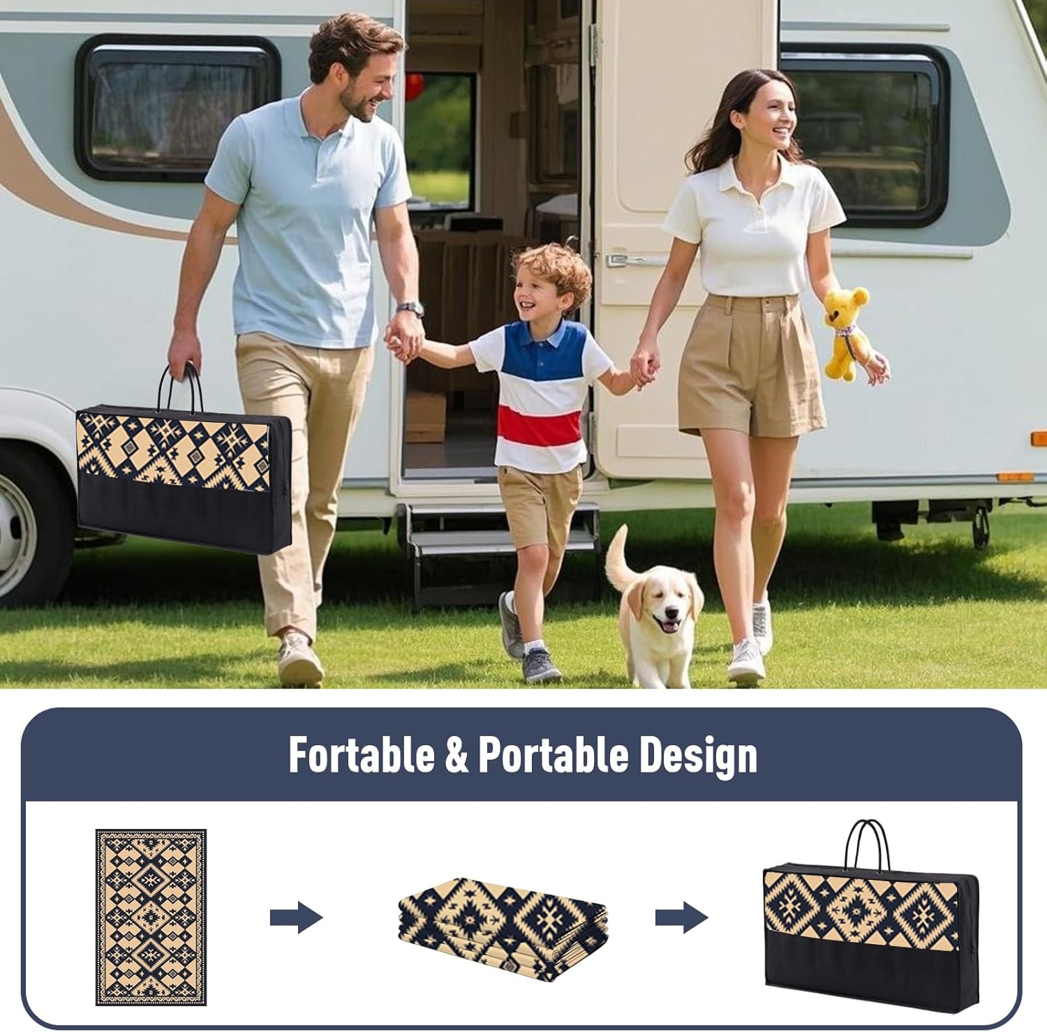 - Reversible Design: This double-sided patio rug features beautiful patterns on both sides, allowing you to quickly flip it over and instantly refresh your patio, porch, backyard, deck, RV campsite, or any outdoor space. A simple way to transform your style effortlessly