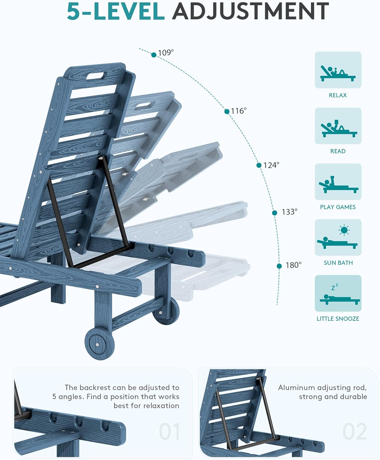 SERWALL Outdoor Chaise Lounge, 78" Length Patio Chaise Lounge Chair with 5 Positions Adjustable Backrest, HDPE Lounge Chair with Rolling Wheels & Cup Holder for Pool, Blue