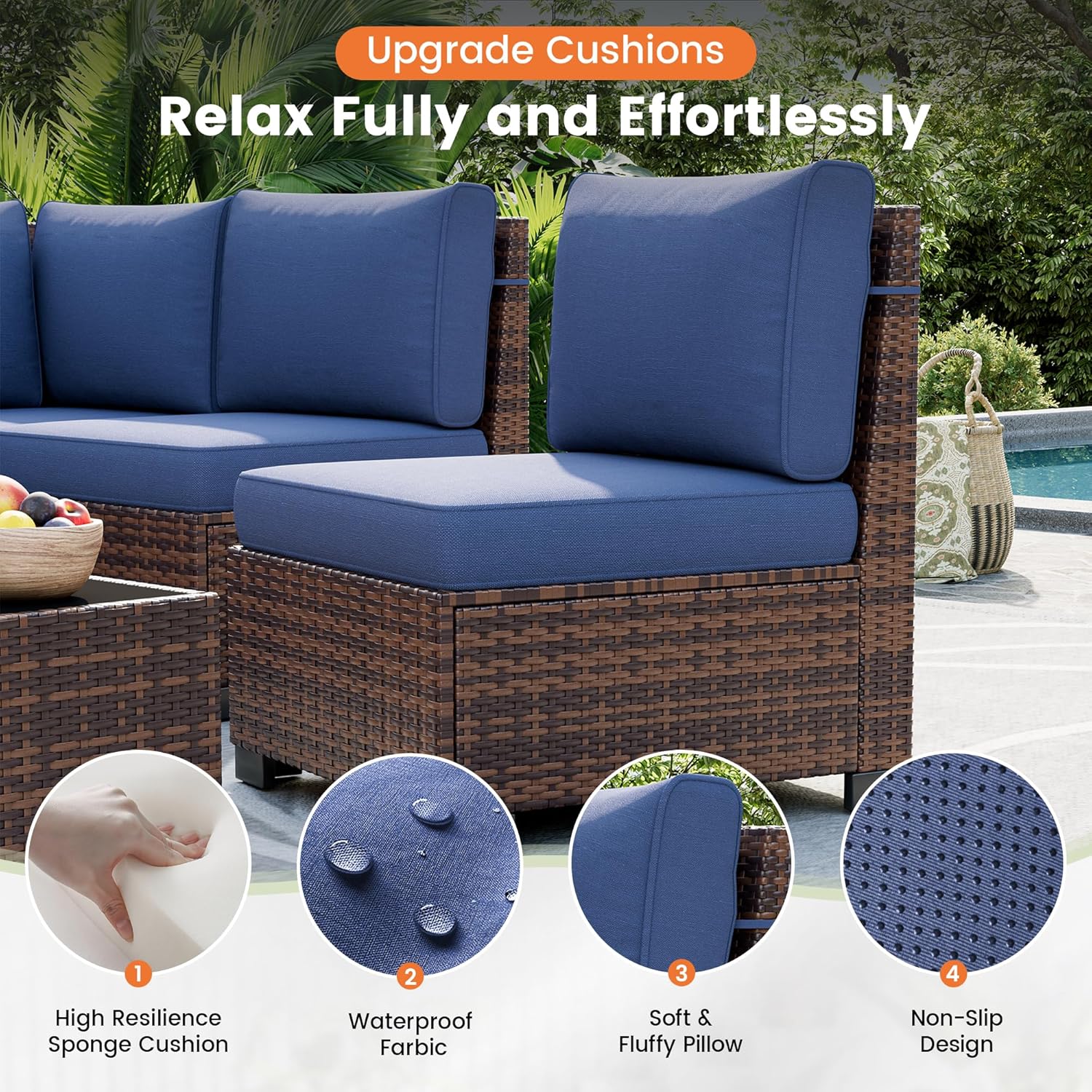 UDPATIO Patio Furniture Set with Fire Pit Table, 8 Inch Armrest Outdoor Sectional Sofa, Wicker Outdoor Furniture Conversation Sets with Waterproof Cover for Backyard Deck(Brown/Navy Blue)