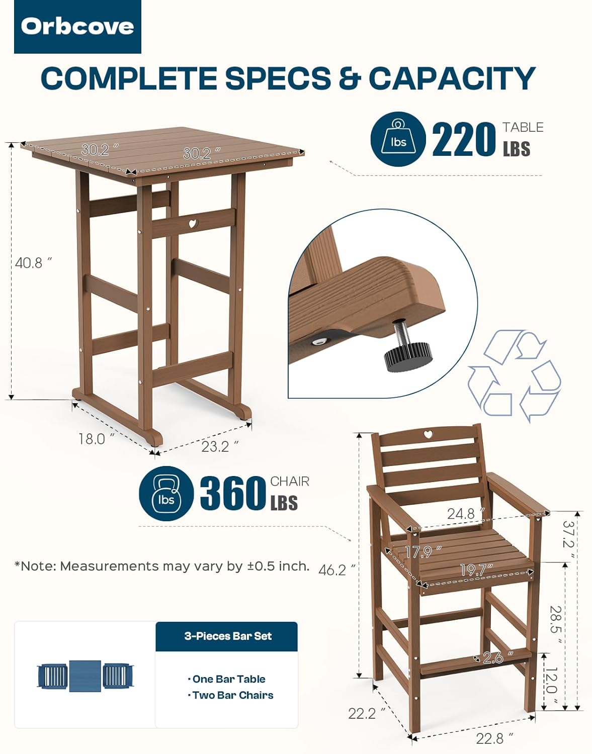 - Durable All-Weather Design: (Your order will arrive in two separate shipments, which may not be delivered simultaneously.) Crafted from HDPE with a natural wood grain finish, Orbcove bar table and chairs set withstands sun, rain, and wind without fading or cracking. Ideal for deck furniture, backyard furniture, or porch furniture, it’s perfect for year-round outdoor living.