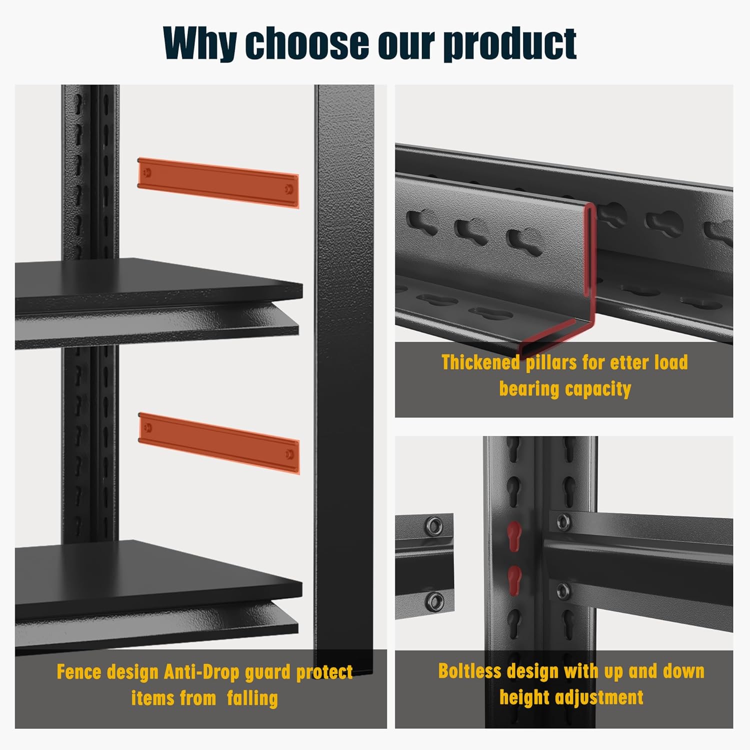 - 【Garage Shelving Heavy Duty】:Our metal storage shelves are made of heavy-duty steel and have been upgraded to double layered columns, each with supporting ribs, and the surface of the shelves is coated with high-quality powder coating. It is not only sturdy and durable, but also ensures that the shelf maintains its appearance and performance in various environments. Each shelf can carry up to 900 pounds, and the maximum weight capacity of 4500 lbs.