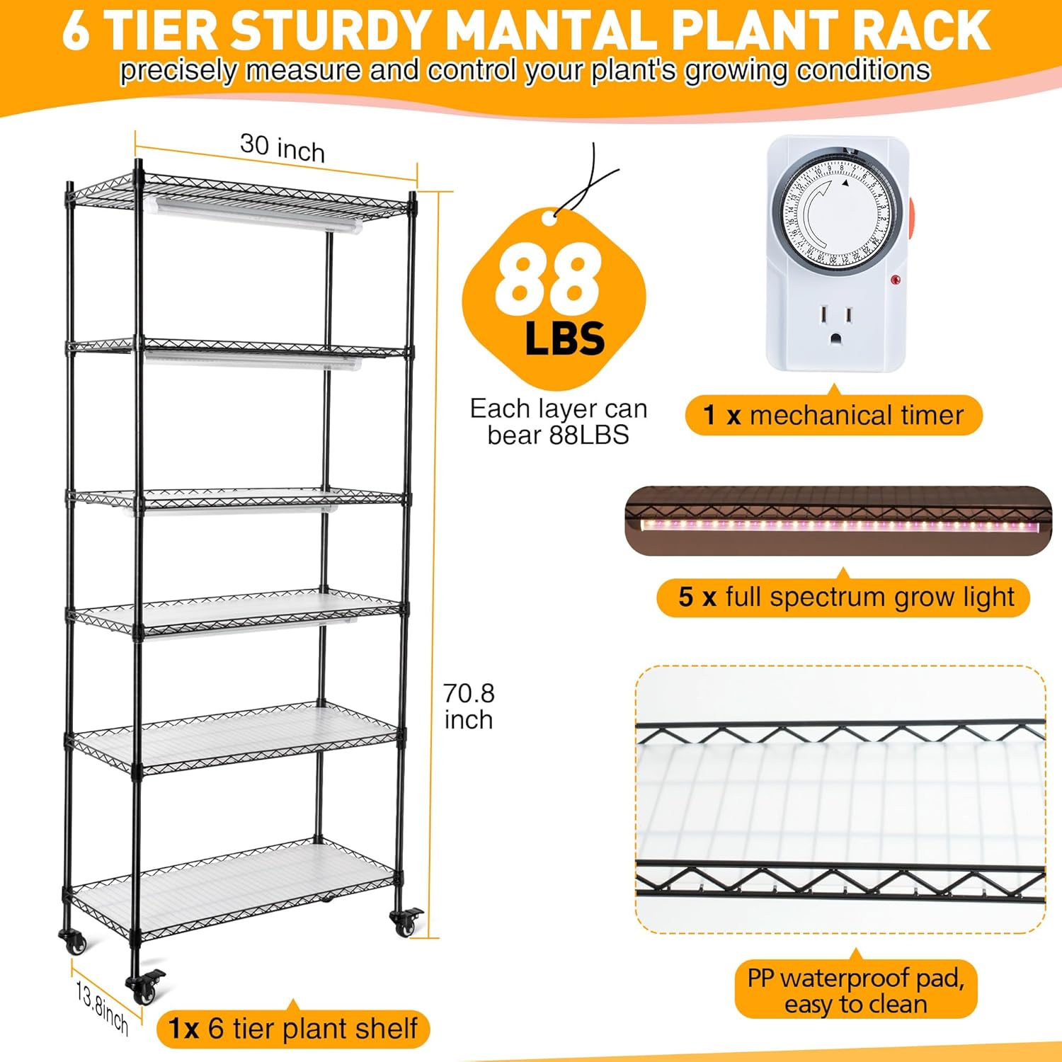 - Complete Indoor Greenhouse Kit: Package includes 1 x 6 tier plant rack, 1 x full spectrum grow light, 6 x PP waterproof pads; 1 x Mechanical timer; These accessories empower you to precisely measure and control your plant's growing conditions, ensuring optimal growth