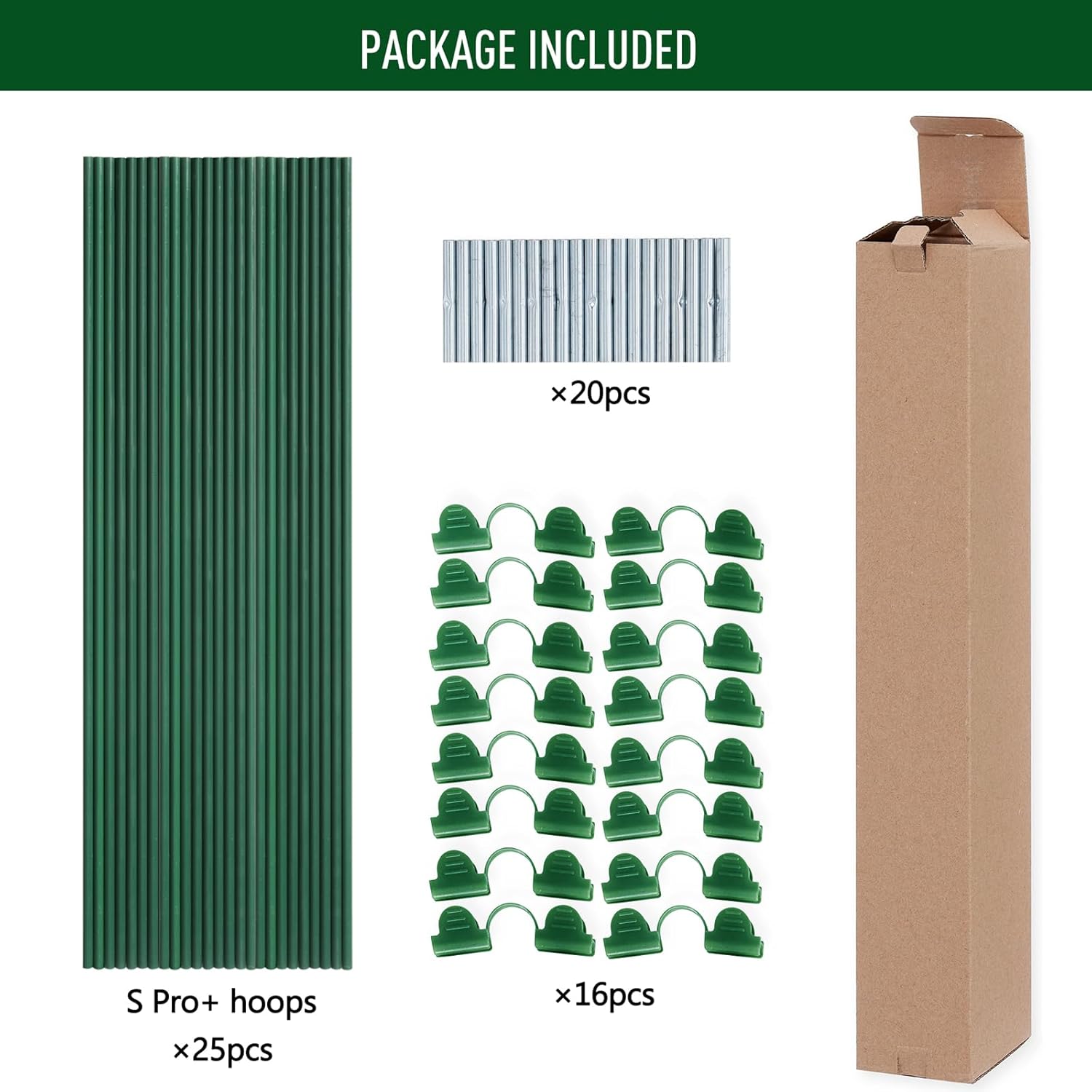 - 【DIY KIT】Includes 25 small-diameter hoops, each 17" long, 20 connectors, and 16 clips. You can combine 4 or more hoops to create your own grow tunnel. The clips can also be used to secure the greenhouse covering.