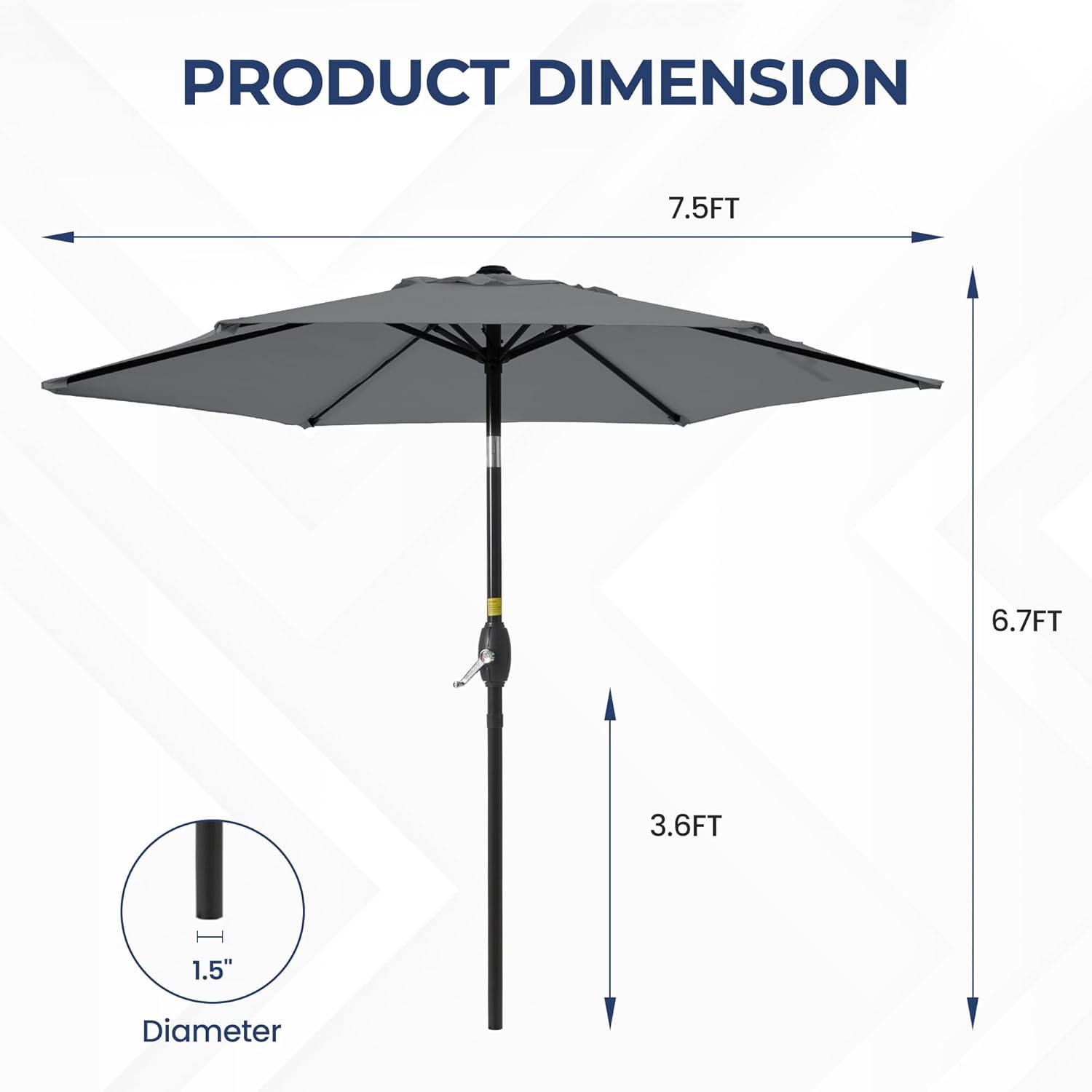 - WIDELY USED: 7.5' patio umbrella is a perfect must-have for summer or sunny day shade for patios, beaches, plazas, gardens, and patio stores like cafes and restaurants. Total size (L x W x H): 87β x 87 β x 85β (without base)