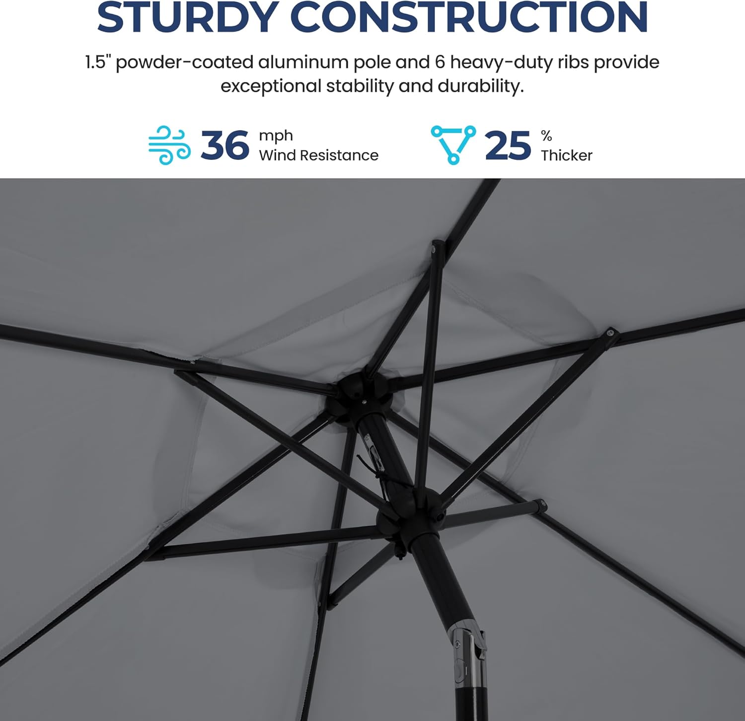 - STURDY FRAME: Beach umbrella sturdy 1.5" metal rods are powder-coated metal to prevent rusting or bending. Parasol thickened iron bones and six heavy-duty steel ribs provide additional support for durability and stability