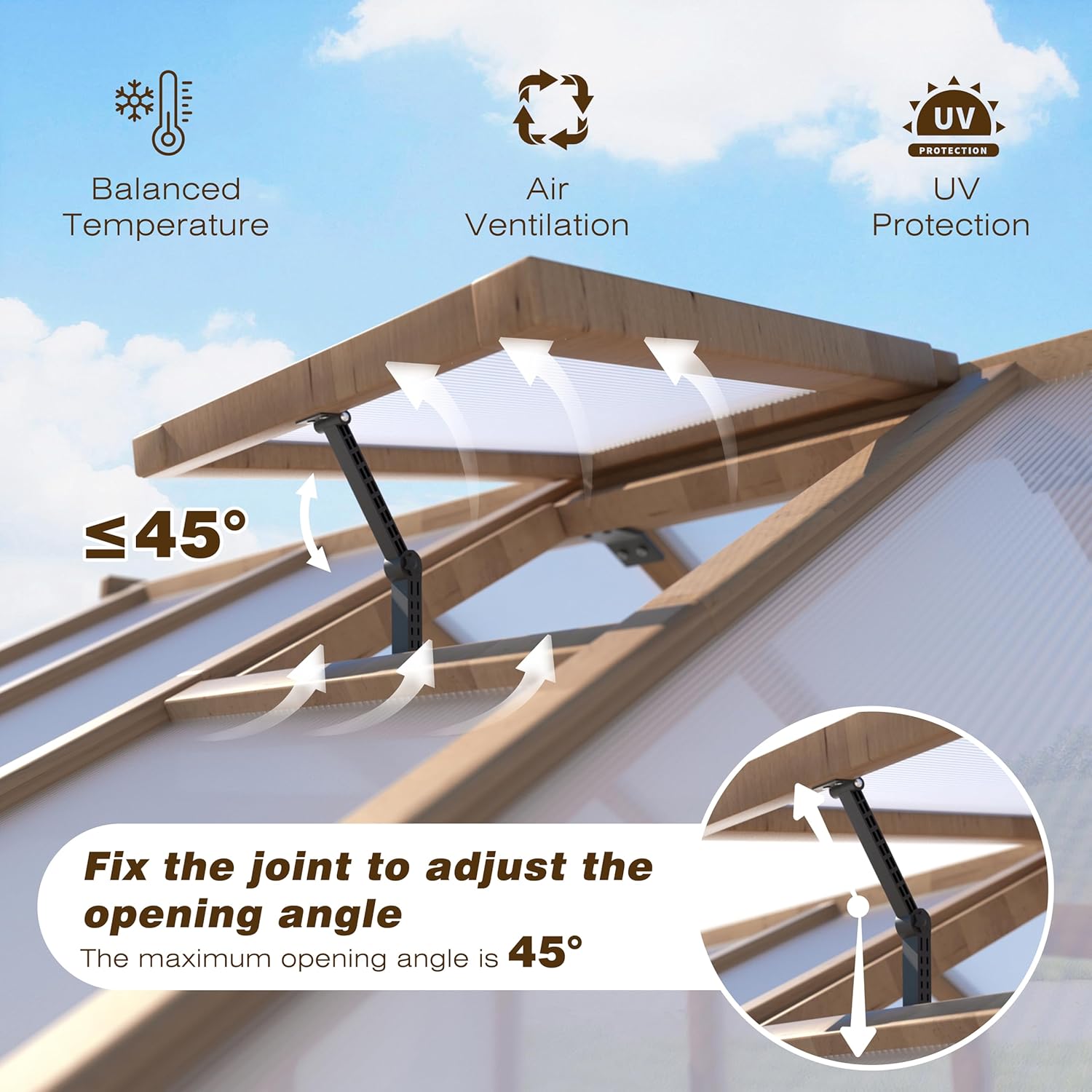 - Year-Round Plant Protection - The wood greenhouse features an adjustable vent, providing your plants with optimal growth conditions by regulating temperature and airflow. Our polycarbonate greenhouse is perfect for safeguarding against unexpected weather changes. This feature is essential for preventing overheating and promoting the health of your garden.