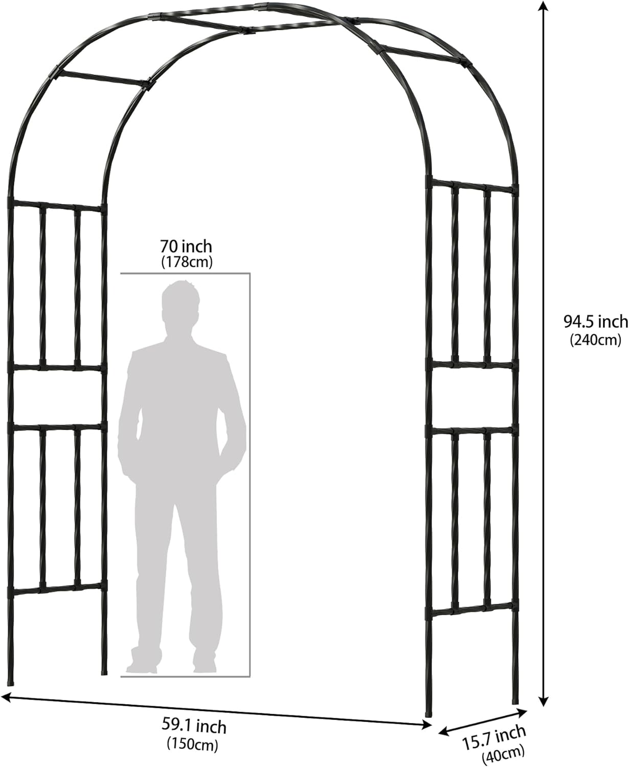 - [Perfect Height Design] - Standing at 7.9FT(240cm) extra tall, this metal garden arch allows easy passage and serves as an ideal walkway in your garden. It adds elegance and functionality to your outdoor space, dimension is 59.1" x 15.7" x 94.5"(150cm x 40cm x 240cm), making trellis arch suitable for gardens, backyards, lawns, beaches, hotels, pathways and more.
