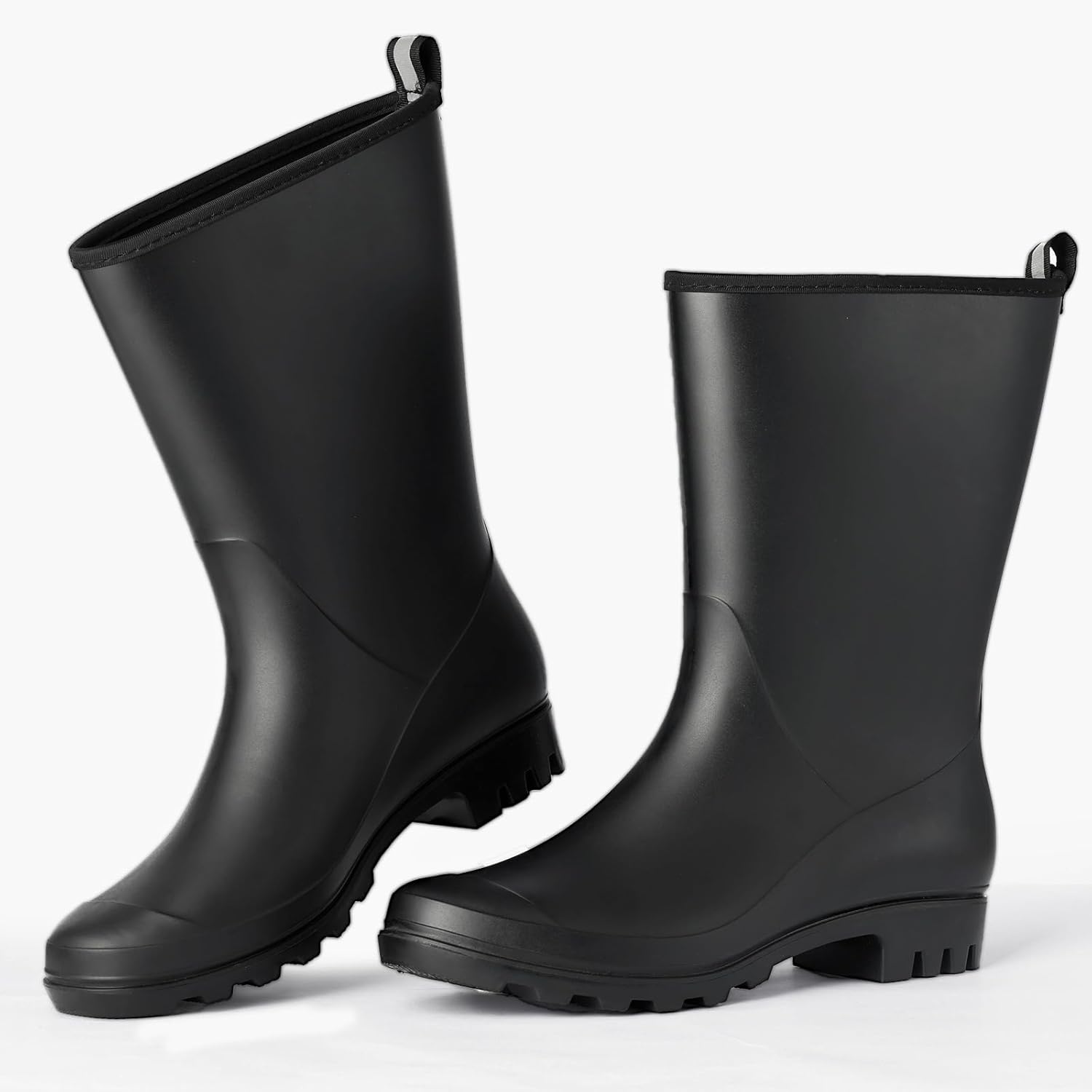 - Mid Calf Rain Boots for Women: Designed for wide calves, these matte-finished Wellington boots offer a perfect fit. If you have slim calves or narrow feet, consider sizing down for a snug fit. Made from premium PVC, these boots provide complete waterproof protection and exceptional flexibility for all-day comfort.