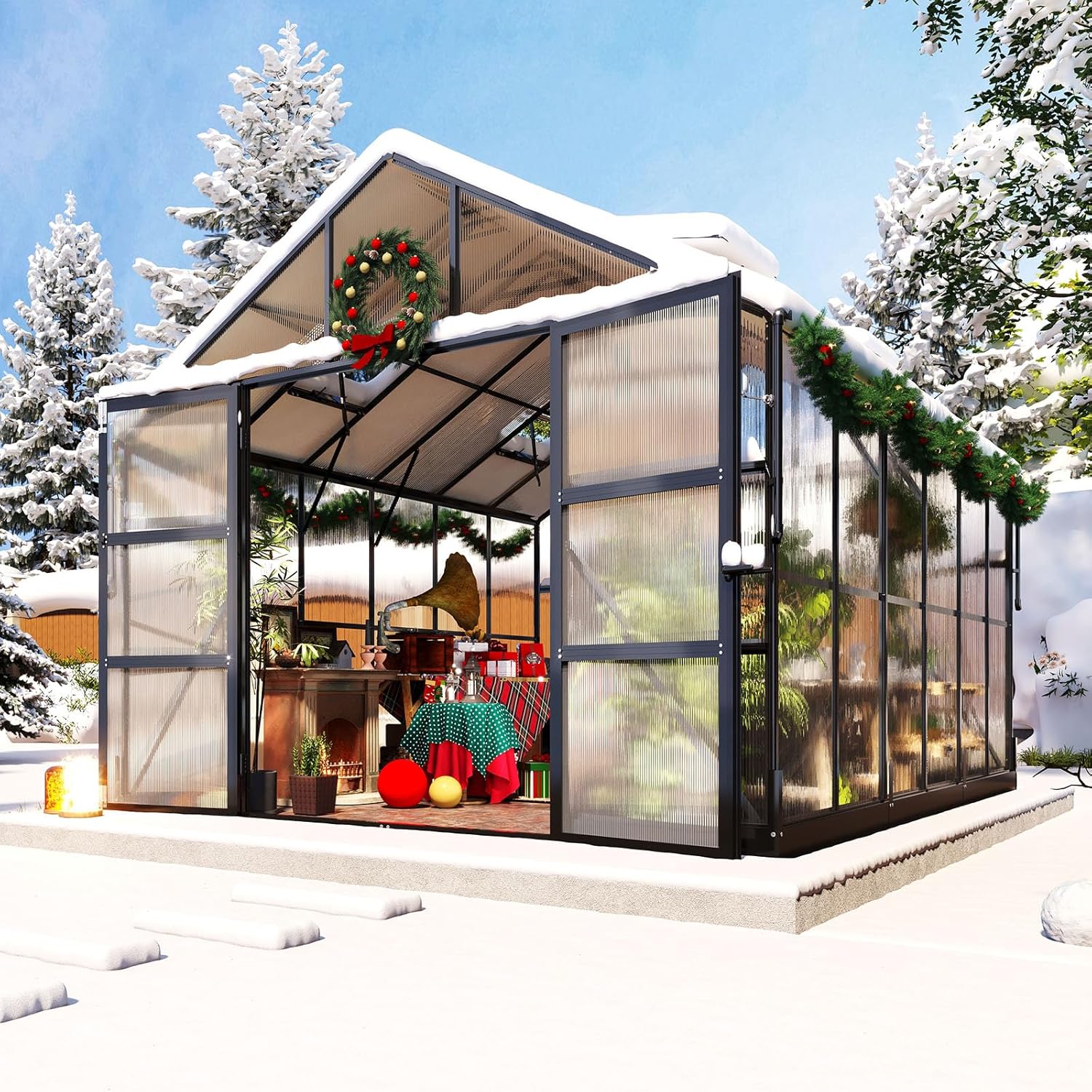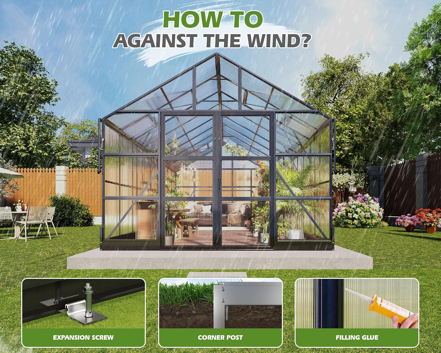- 【All-Weather Greenhouse】Polycarbonate greenhouse is constructed using a premium aluminum frame, It also offers thickened corner posts, ground stakes, expansion bolt and fixed steel plates to securely anchor the greenhouse into both concrete and soil.
