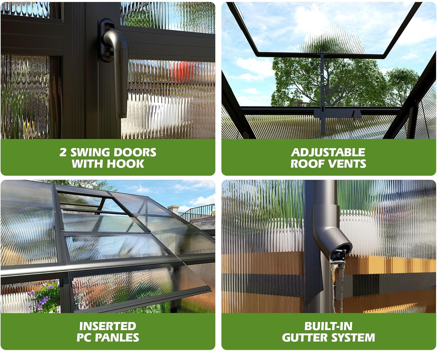 - 【Premium Panels】 Unbreakable polycarbonate panels with UV protective coating ensure your plants are protected from 99.99% of harmful solar radiation, while also creating a comfortable environment for optimal growth.
