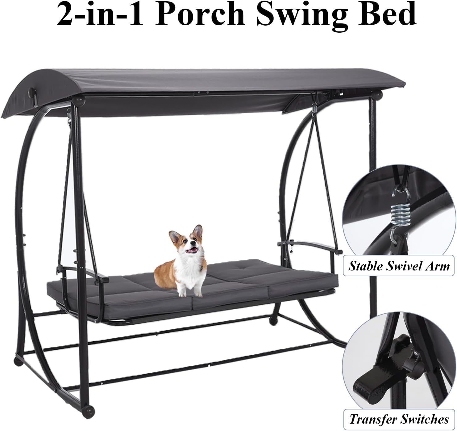 Patio Swing with Canopy, Outdoor Swinging Bench with Stand, Backyard Swings for Adults, 2 in 1 Porch Swing Bed, Outdoor Patio Swings,Yard Heavy Duty Covered Patio Swing, Grey