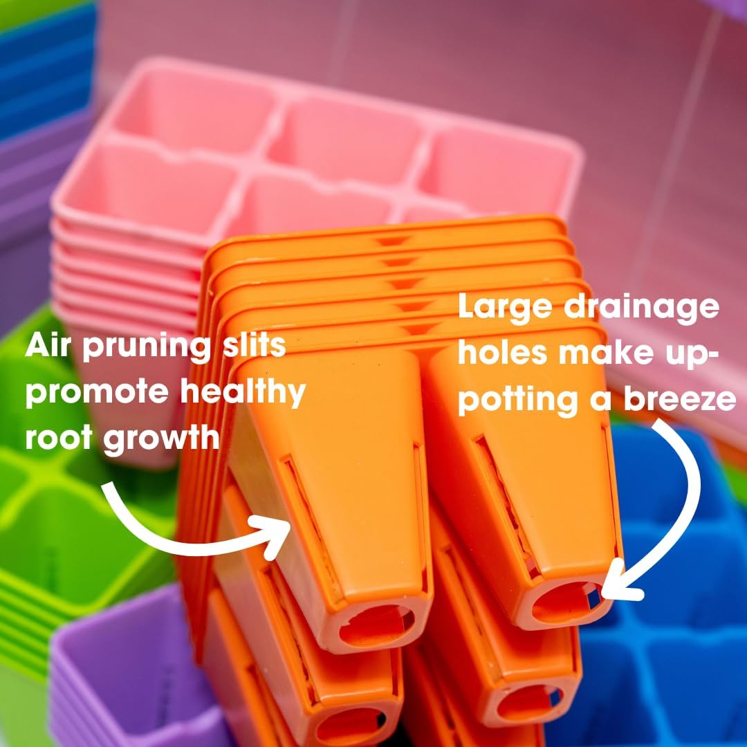 - Complete seed starting kit: 60 professional cell plug inserts, 5 heavy-duty trays, 90 transplant pots, and 5 humidity domes - everything needed to grow your entire garden from seed to transplant