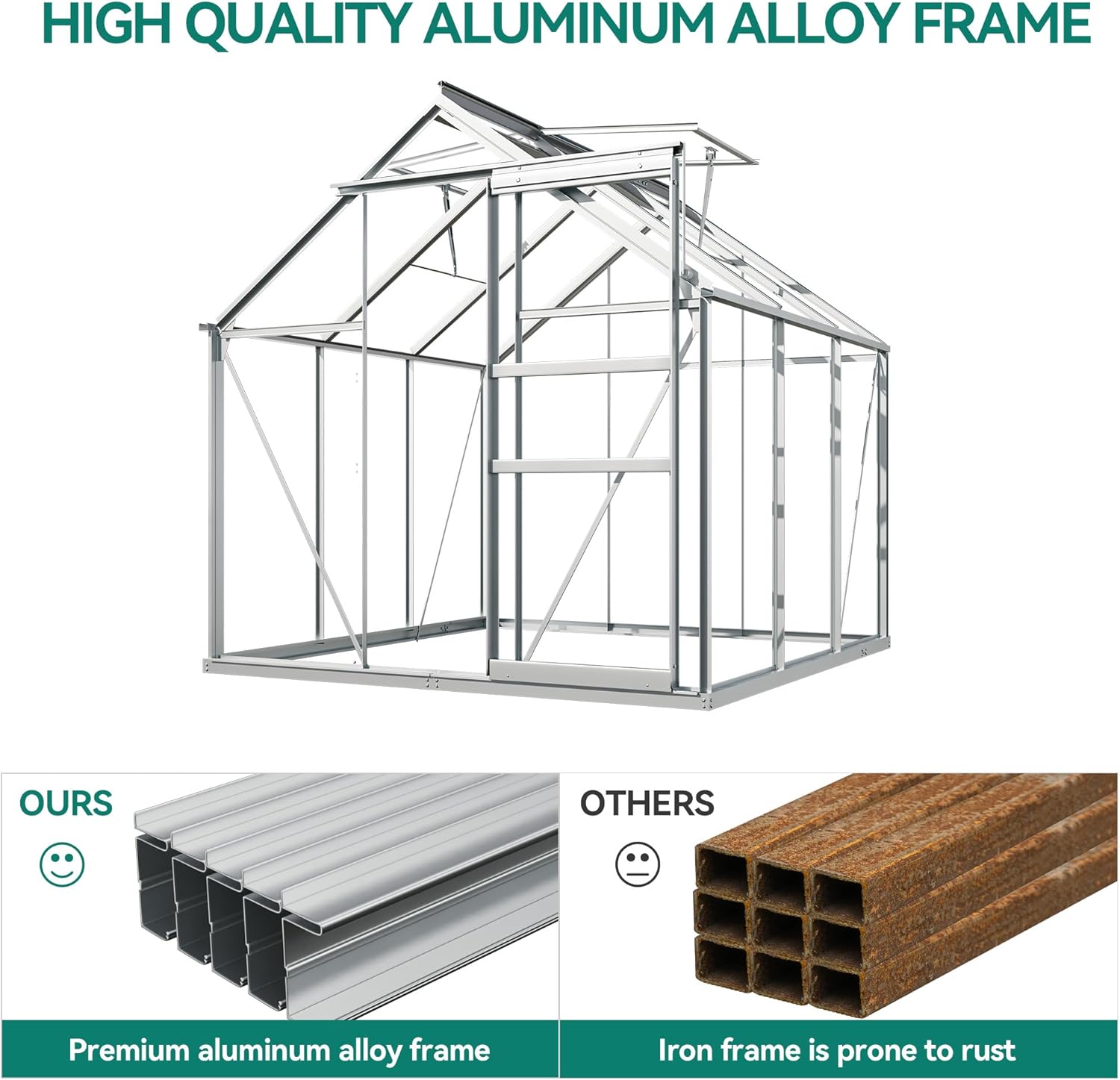- UPGRADED MATERIALS- Polycarbonate greenhouse is constructed using a reinforced aluminum alloy frame, along with reinforced rods on the sides and diagonal rod fixation for enhanced sturdiness and load-bearing capacity; Double-wall polycarbonate boards with 4mm UV protection effectively blocks 99% of UV radiation to protect your plants