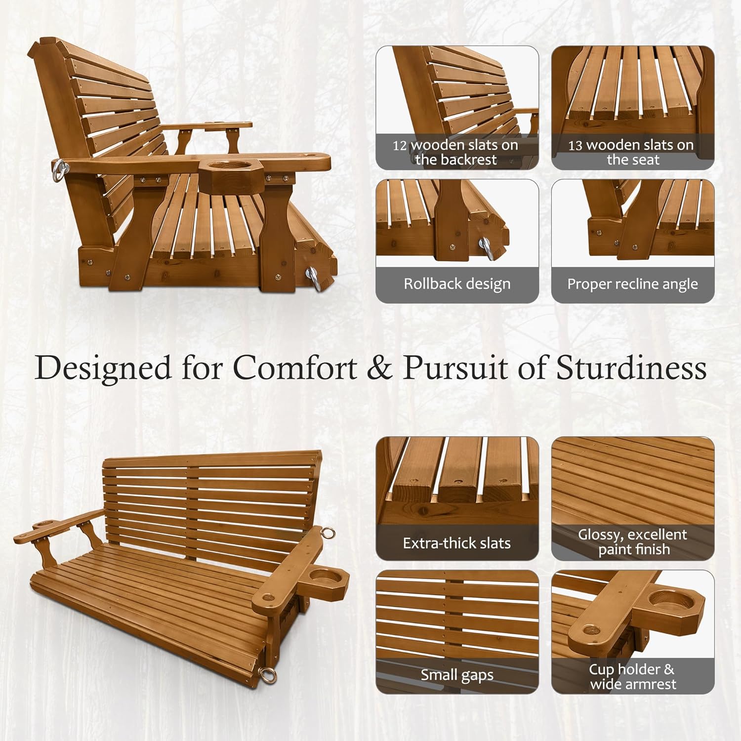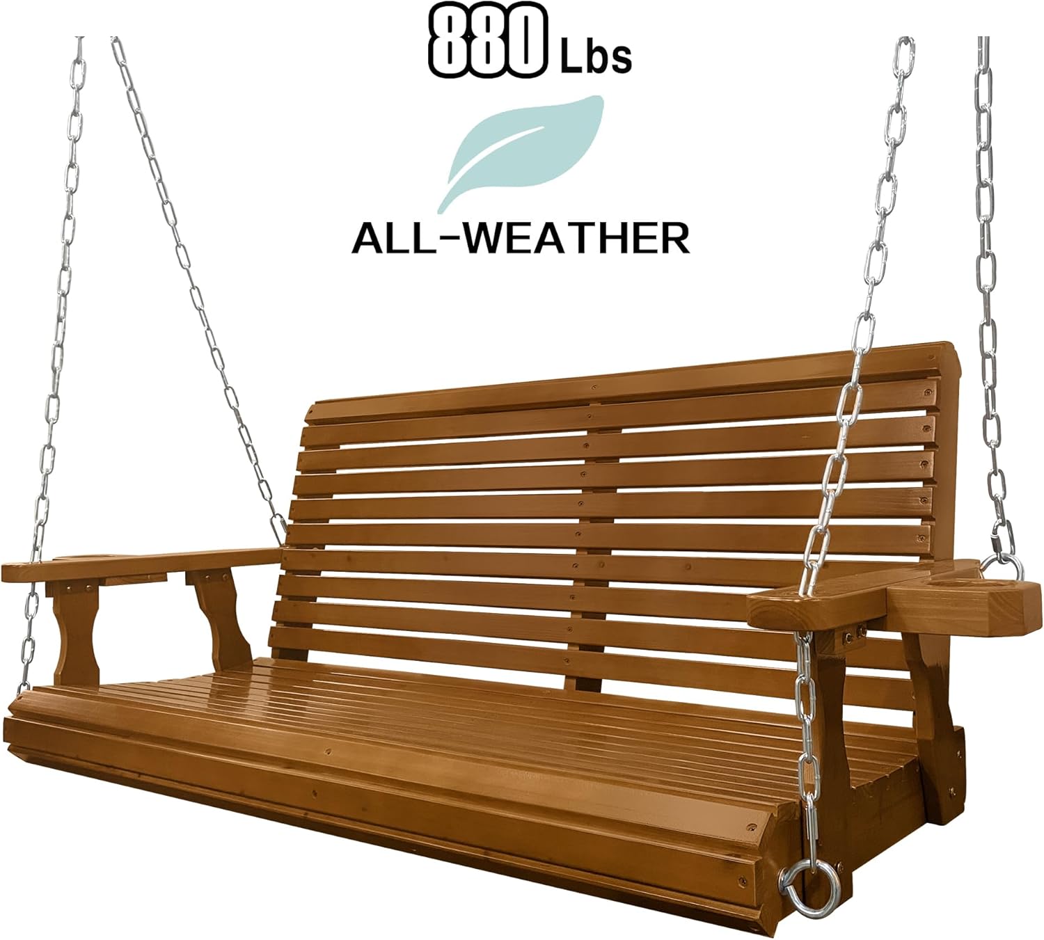 Wooden Porch Swing 2-Seater, Bench Swing with Cupholders, Hanging Chains and 7mm Springs, Heavy Duty 880 LBS, for Outdoor Patio Garden Yard (Cedar Tone, 4.5 FT Extra Large)