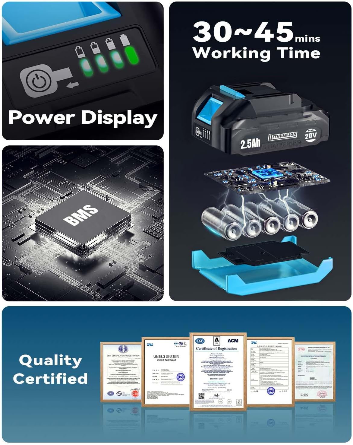 - YardEz 20V Weed Wacker is upgraded again: Equipped with two 2500 mAh battery packs with intelligent protection, each can actually work for up to 45 minutes.
