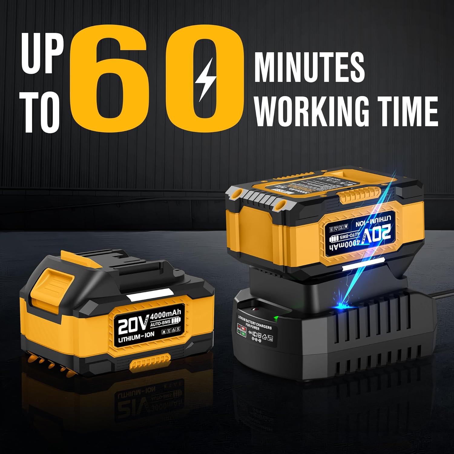 - Longer Battery Runtime - Say goodbye to the cord limitations and bulky noise of traditional leaf blower. Upgrade to the EWORK battery-operated leaf blower. Equipped with a fast charger and 2 x 4.0Ah 20V batteries, it offers 60 minutes of low-speed mode and 30 minutes of high-speed mode, ensuring uninterrupted yard work efficiency, Ideal for medium to large yards