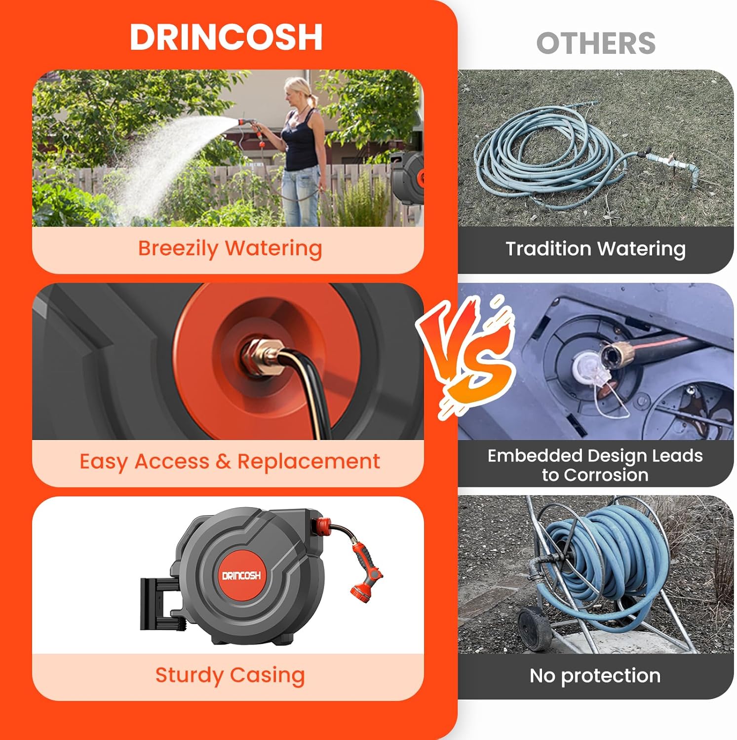 - 【20000+ Times Test & UV and Freeze Protection 】DRINCOSH’s retractable hose reel has been rigorously tested over 20,000 retractions, proving its exceptional durability and reliability. Additionally, the outer casing features a UV and freeze-resistant materials, extending its lifespan while maintaining its appearance and performance year after year