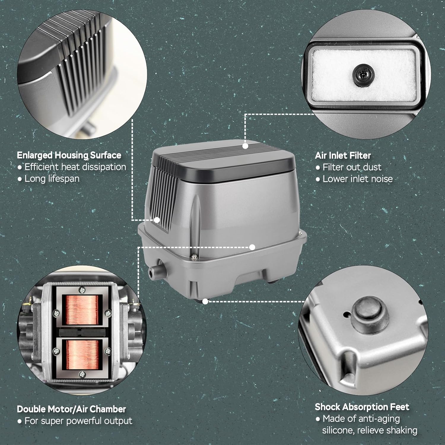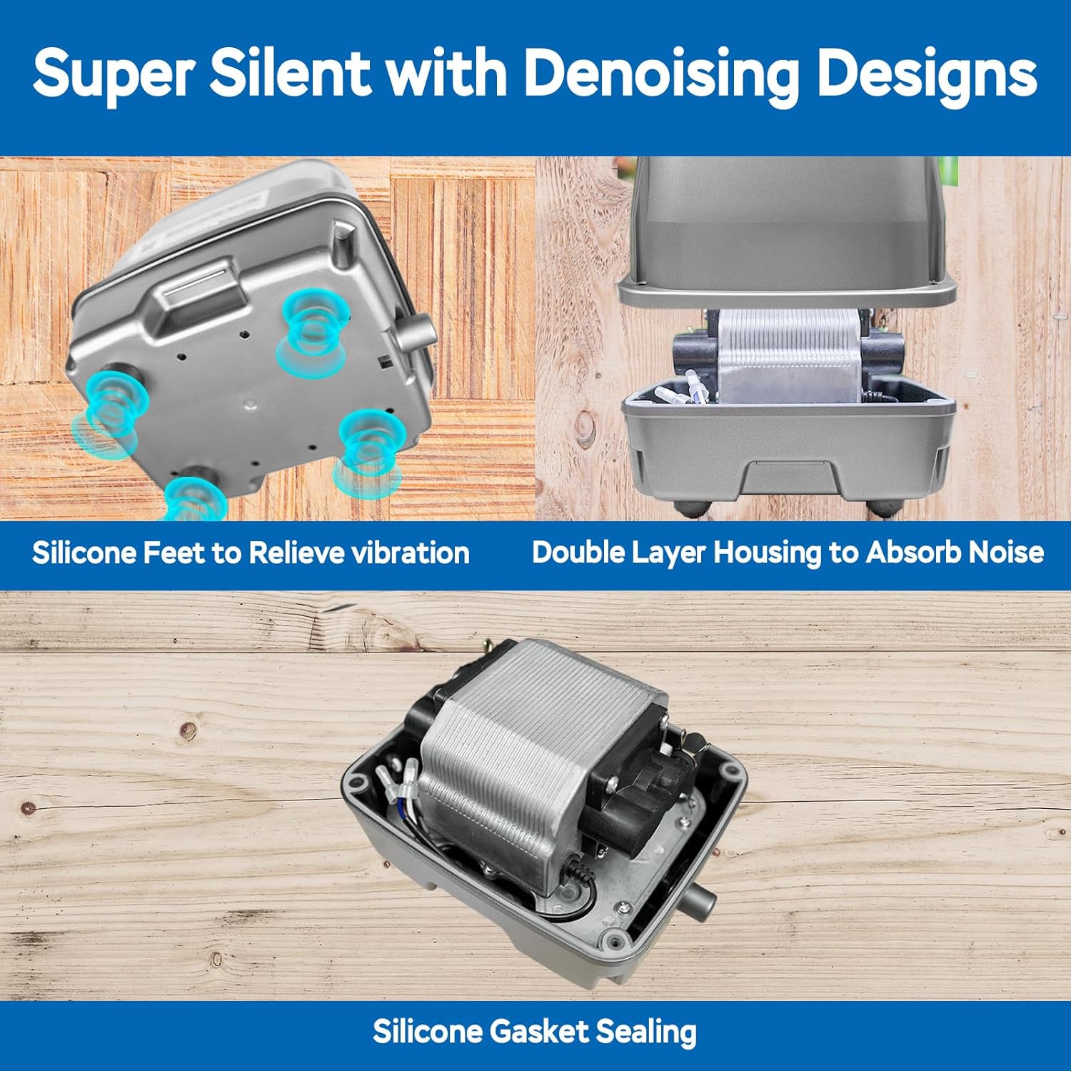 - QUIET - Our linear air pump experiences near-silent performance thanks to our multi-layer noise reduction system: double-layered housing, vibration-absorbing silicone feet, and precision silicone gasket sealing.