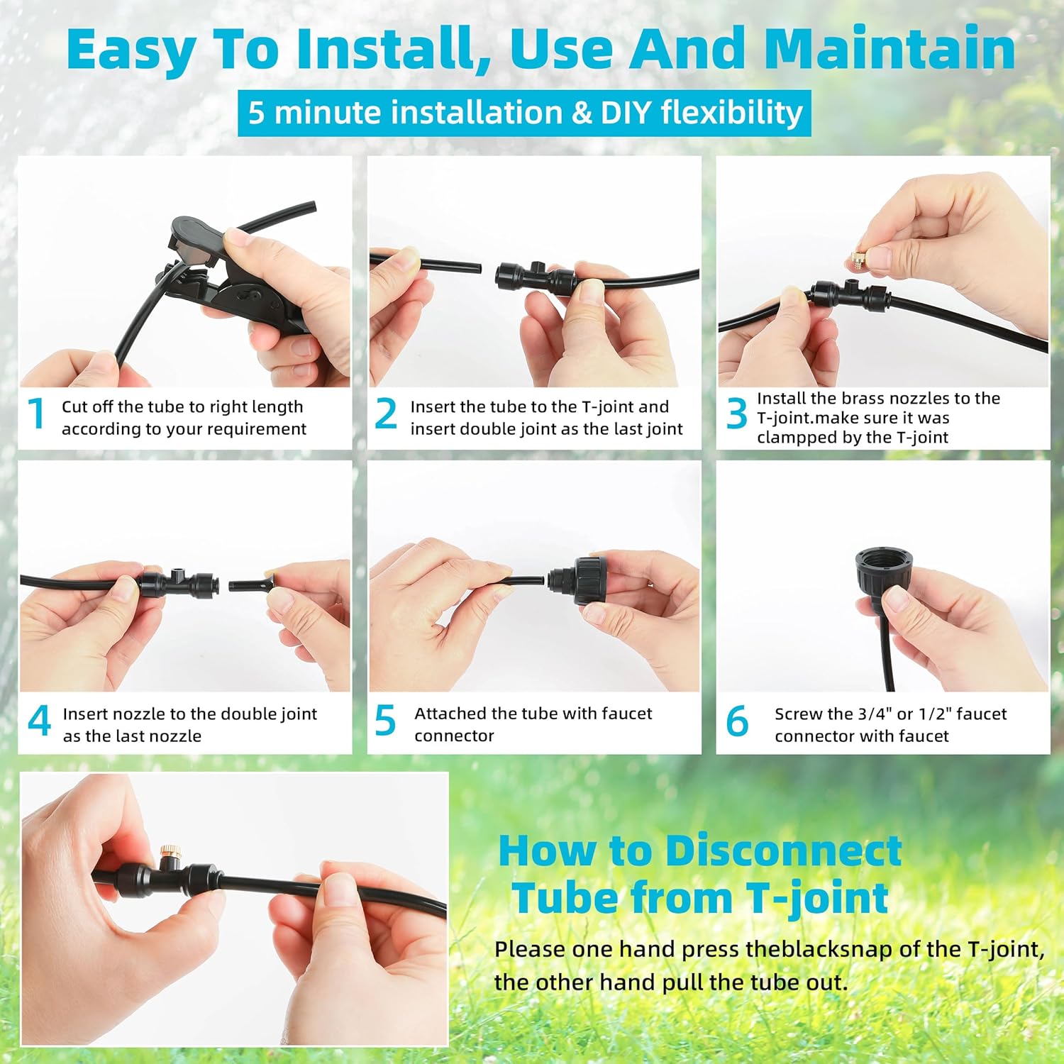 - Installation Steps: Misting Watering System,1. Take out the misting line and cut it according to the required length 2. Insert the misting tube into the mister system 3. Insert the end into the nozzle of the cooling system with a plug 4. Connect the anti-oxidation adapter (3/4") to the faucet.