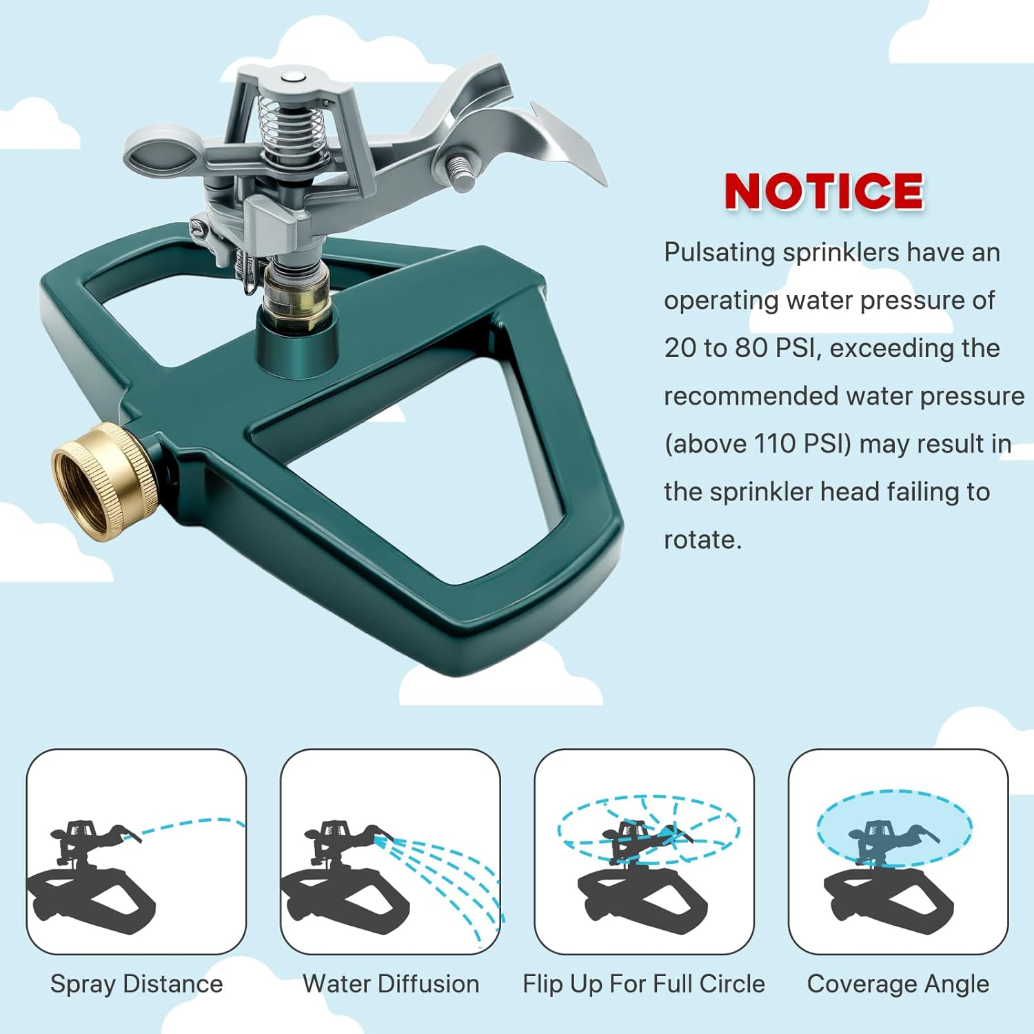 - Notice: Pulsating sprinklers have an operating water pressure of 20 to 80 PSI, exceeding the recommended water pressure (above 110 PSI) may result in the sprinkler head failing to rotate.