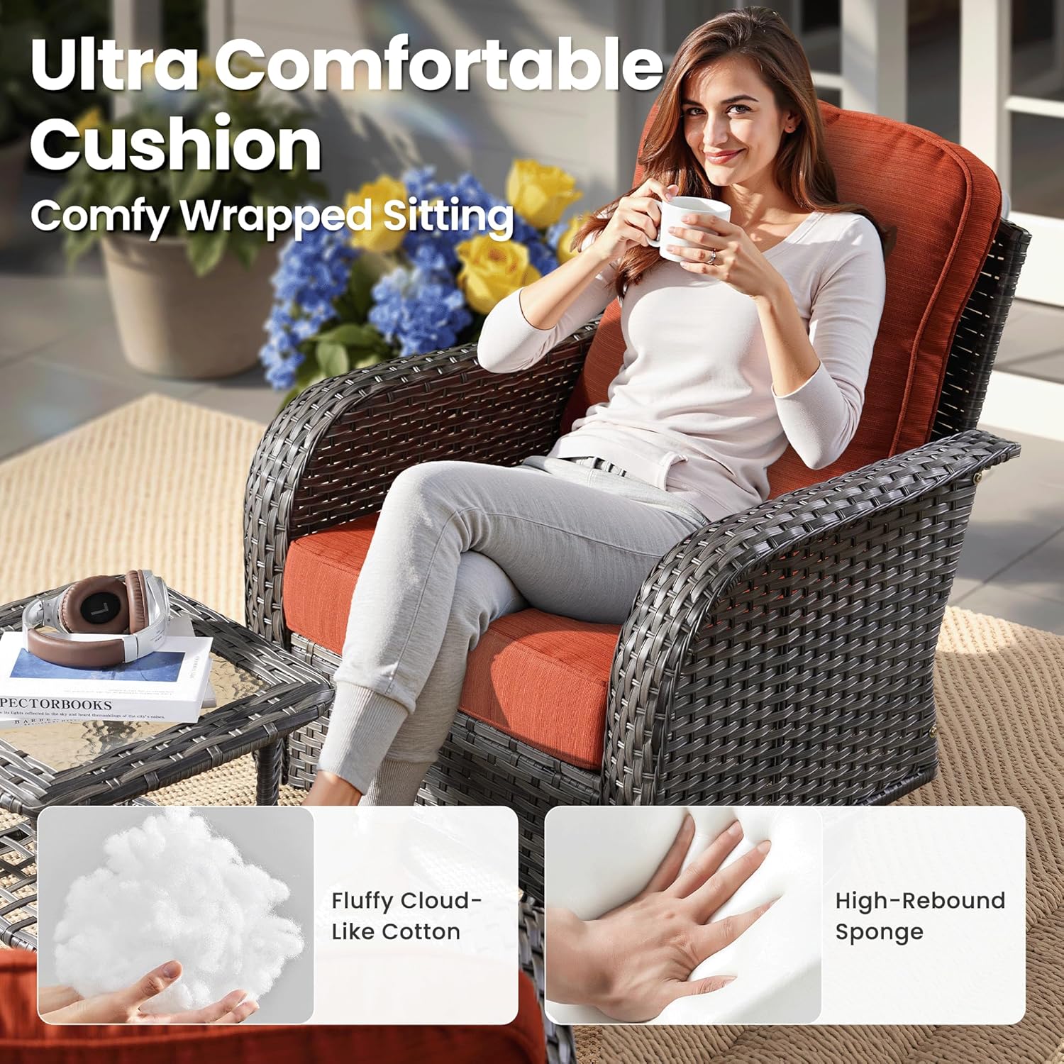 ovios 3 Pieces Patio Furniture Set, Outdoor Rocking Chairs of 2, Wicker Swivel Glider Chairs with Side Table Thick Cushions, All Weather Rattan Bistro Set for Porch, Orange Red