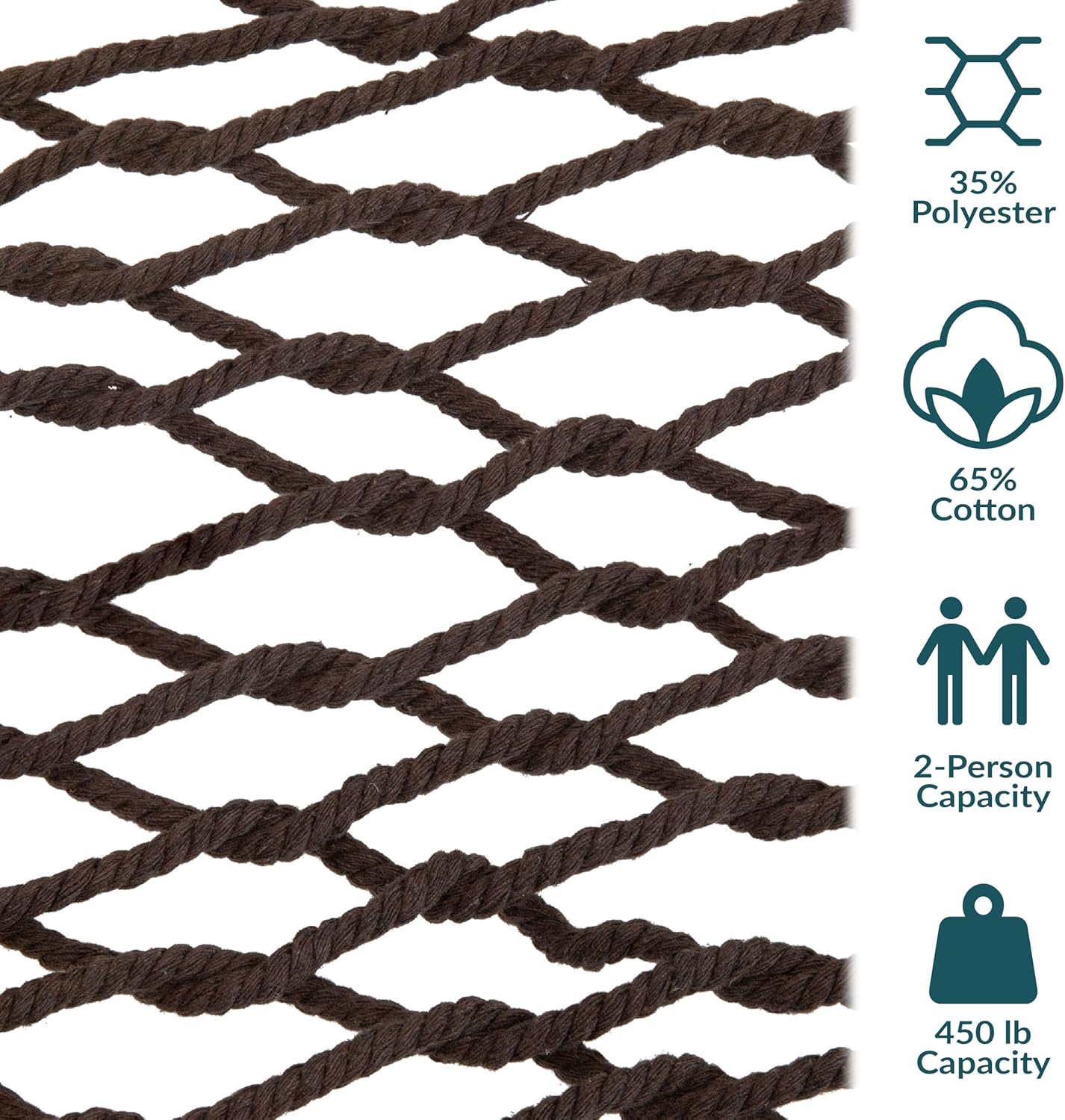 - CLASSIC AND DURABLE: This double hammock with spreader bar is made from a soft 65% cotton and 35% polyester rope material and features classic hardwood spreader bars for added style, comfort, and relaxation.