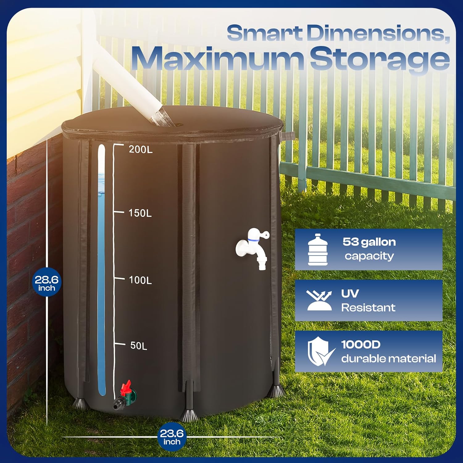 - 【LARGE CAPACITY & REUSABLE】This collapsible rain water collection barrel is reusable and has 53 gallons water storage capacity with 28.6 inches in height and 23.6 inches circular. Place it under a downspout and let water run through the mesh top. The foldable design is easy to store away when not in use. Ideal for all water storage needs like gardening, emergency water, car washing, sprinkler system, livestock, and more.