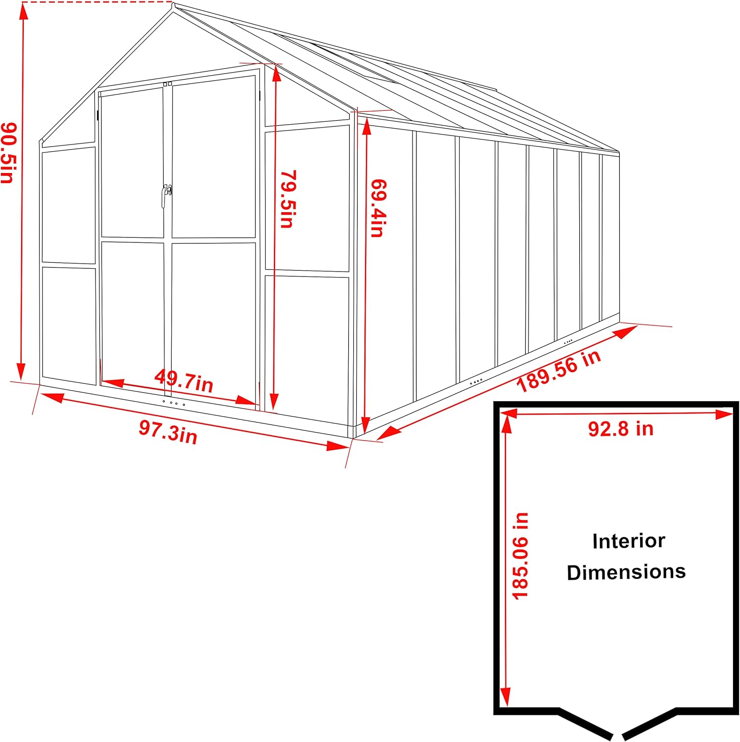 8x16 FT Polycarbonate Aluminum Greenhouse Kit, Outdoor Walk-in Green House with Adjustable Roof Vents and Lockable Door, Backyard Garden in Winter, Gray