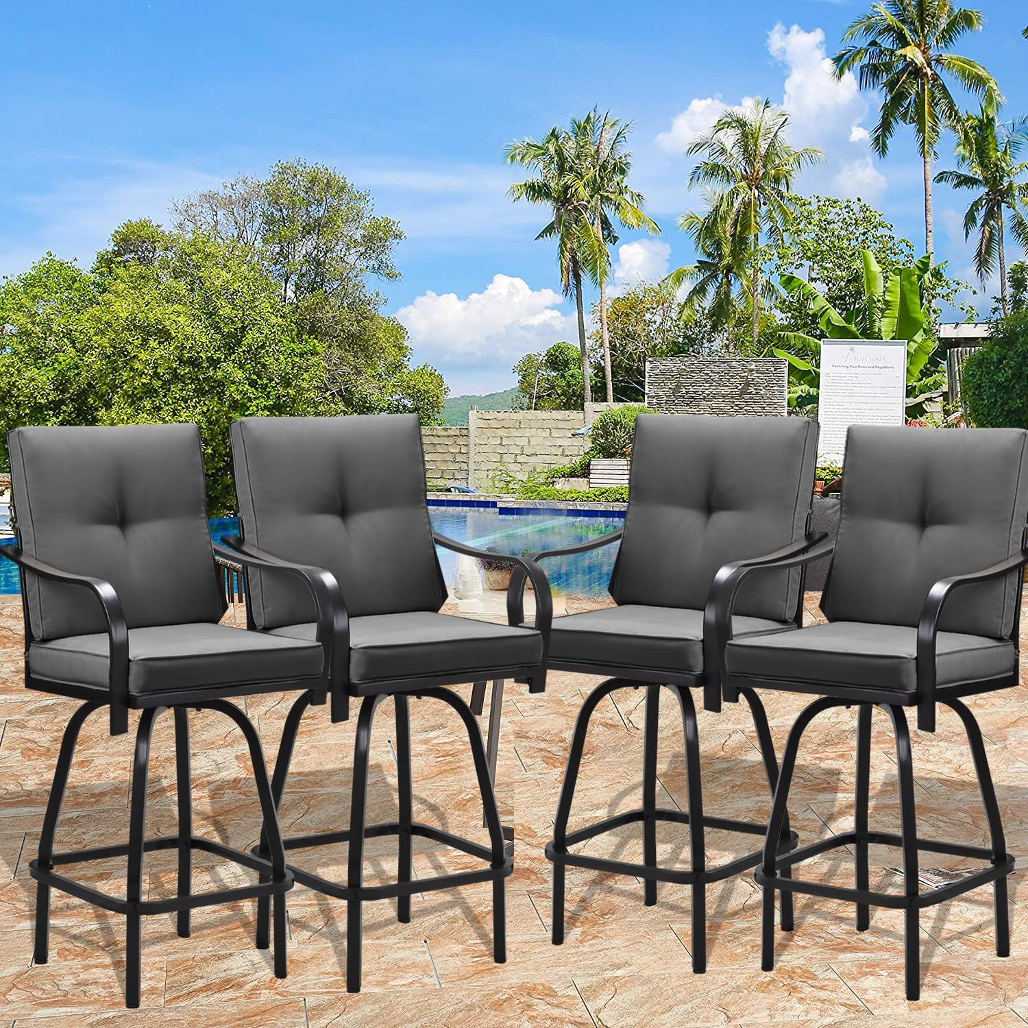 Patio Swivel Bar Stools, Outdoor High Back Swivel Bar Chair Set of 4 with Cushion & All Weather Steel Frame for Backyard, Lawn, Poolside and Balcony, Dark Gray