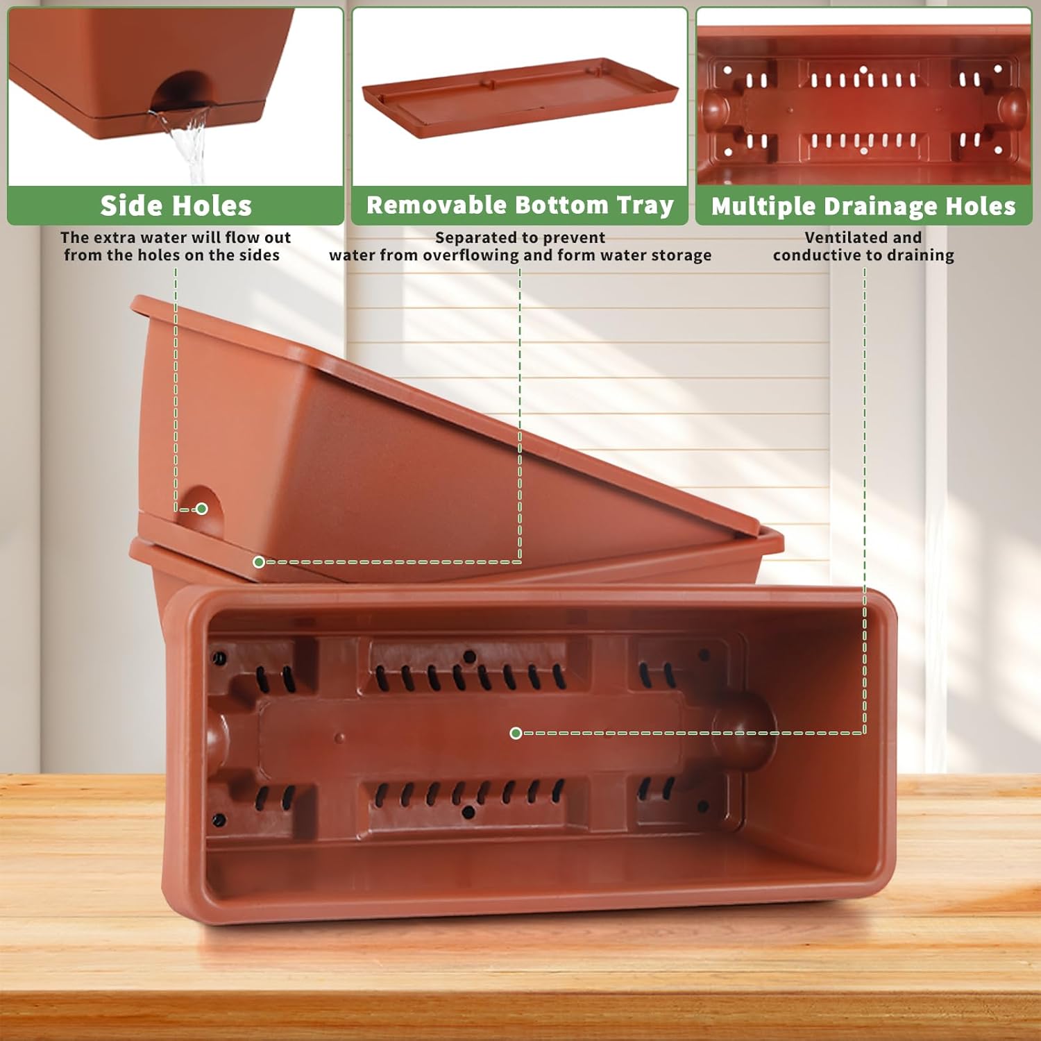 - Water Storage & Drainage Design: The drainage system of the hanging planter box features breathable drainage design ,ensures proper water management ,as each box has bottom holes for drainage ,a tray to collect water to prevent root rot while storing the proper amount of water to maintain perfect humidity levels for healthy plant growth