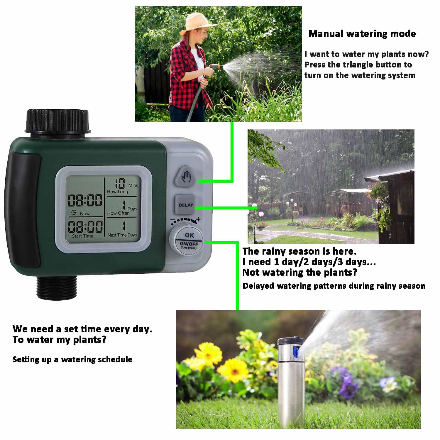 - EASY TO PROGRAM🔶 Automated drip Irrigation system that meets all your watering needs, 2 times a day, once a day, 2 days a times ... Set up your watering schedule in 4 steps, programming is as easy as 123.
