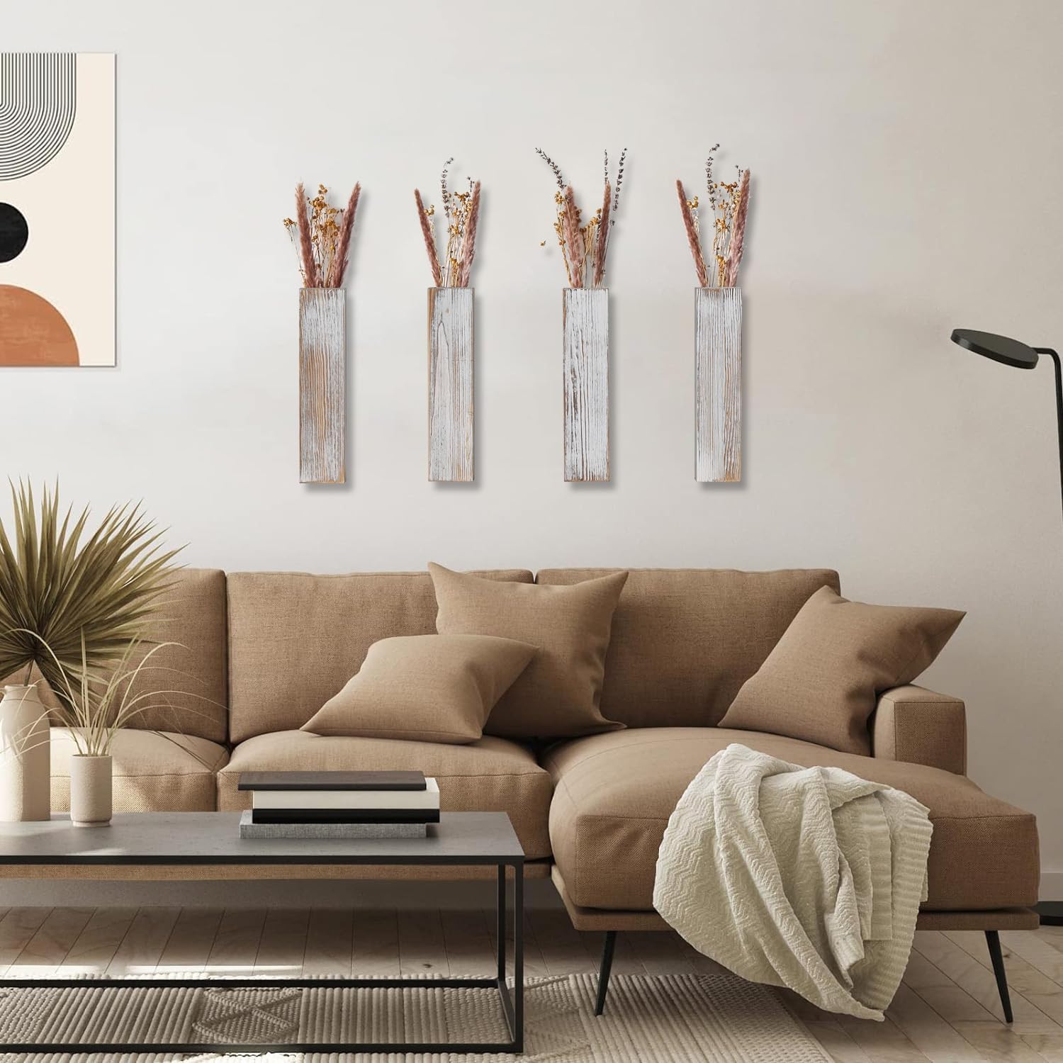 Wooden Wall Planter Set of 4 - Modern Home Decor for Living Room, Bedroom, Bathroom - Vintage Finish Planter for Dried Flowers, Faux Greenery, Indoor Plants