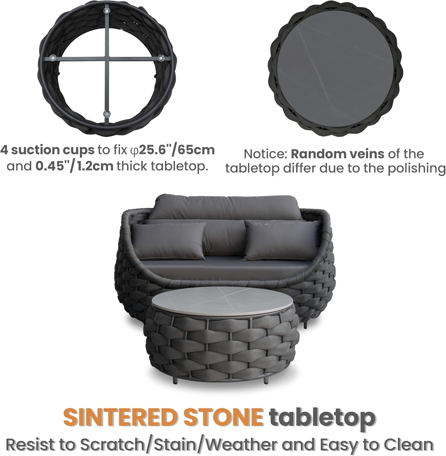 - Easy cleaning and scratch-resistant sintered stone tabletop is fixed by 4 suction cups. Cushions covers replaceable removal and machine washable. Accent loveseat relaxation set equipped with adjustable nylon feet levelers for uneven floor also prevent scratching
